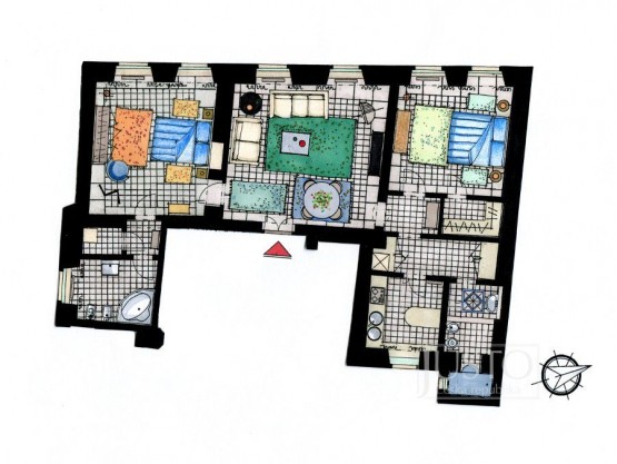 Byt se nachází v prvním patře. Po vstupu do bytu vás okouzlí vybavení s orig...inálním dřevěným malovaným stropem z období baroka, luxusní zařízení a orientální koberce. Prostor je rozdělen na obývací pokoj s jídelnou, 2 ložnice s vestavěným šatníkem, 2 koupelny, kuchyně a komora. Jedna koupelna je vybavená rohovou vanou. Byt je plně vybavený nábytkem, TV se satelitními programy a DVD. Dům se nachází v blízkosti Karlova mostu a parku Kampa v samém srdci Malé Strany Praha 1.