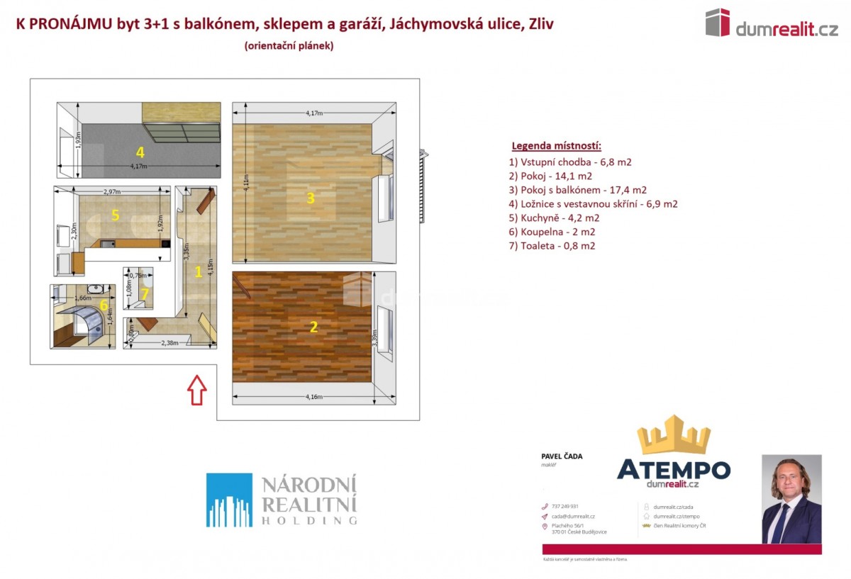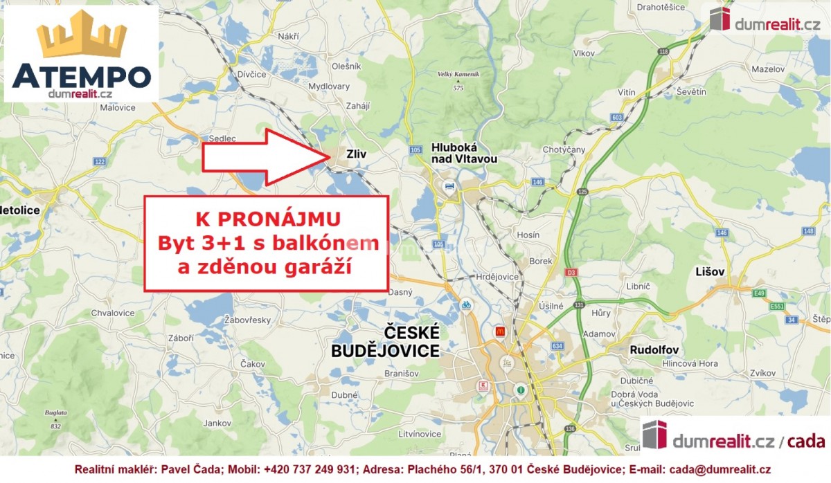 + 6. 000, - zálohy na energie. Více info Vám poskytne makléř Pavel Čada. Dumrealit. cz Vám nabízí pronájem světlého bytu 3+1 s balkónem a sklepem ve zděném bytovém domě ve městě Zl...iv u Českých Budějovic. Byt se nachází na klidném místě města. Podrobné rozkreslení dispozice naleznete na orientačním plánku mezi fotografiemi. Zálohové platby za energie jsou 6. 000, - Kč měsíčně (vytápění, vodné a stočné, el. energie). Součástí pronájmu bytu je zděná garáž vzdálená 300 metrů od domu. V místě bydlení je veškerá občanská vybavenost (školka, škola, praktický lékař atd. ). Doporučuji osobní prohlídku. Více info Vám poskytne realitní makléř Pavel Čada z RK A TEMPO fungující pod ochranou známkou dumrealit. Ev. číslo: 649651. Energetický štítek: C