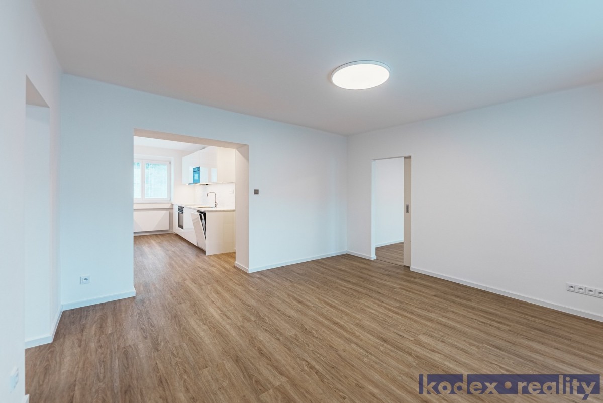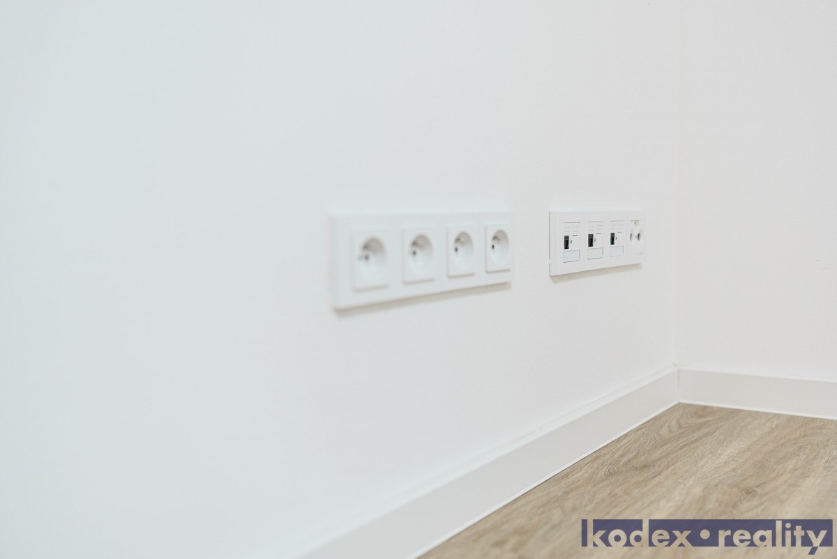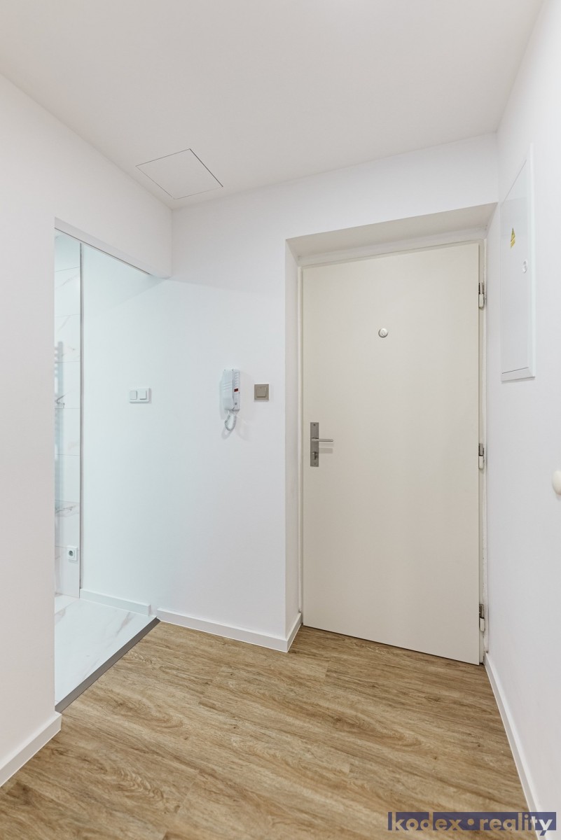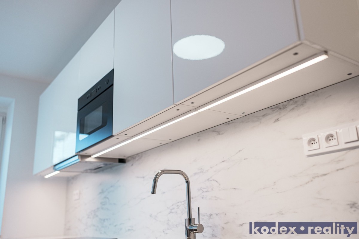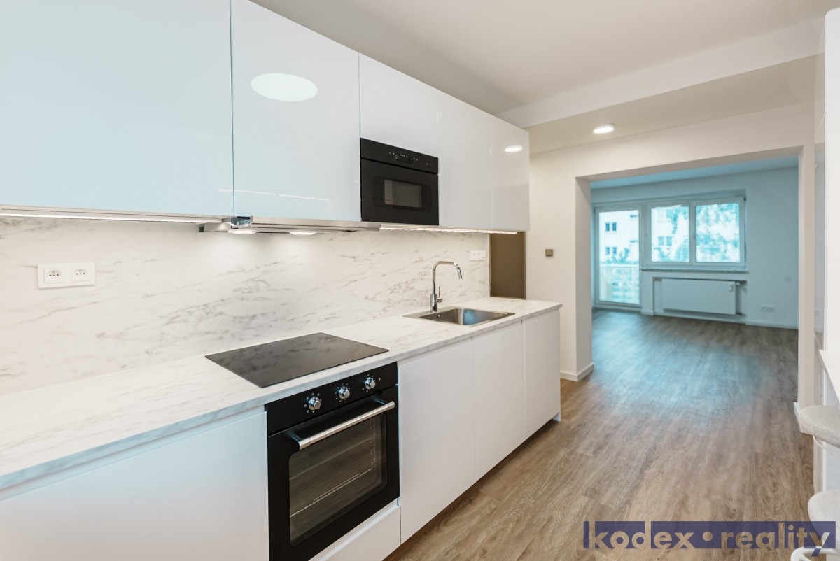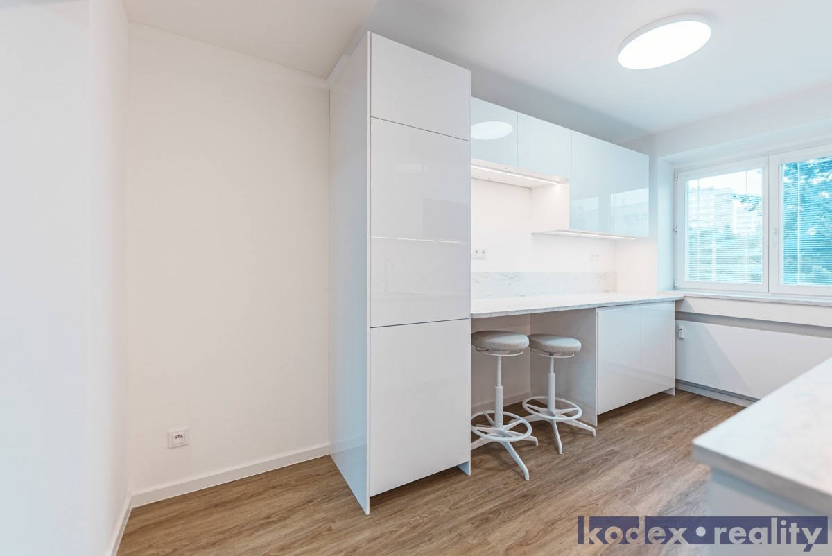 Byt je po kompletní rekonstrukci - nové rozvody elektro, internetové připojeníu a STA včetně zásuvek a vypínačů, LED osvětlení na dálkové ovládání, vinylové podlahy, vchodové i interiérové dveře a nová kuchyňská linka se spotřebiči (el. indukční deska + digestoř, myčka, el. trouba, mikrovlnná trouba) + dvě barové židle, kompletně nová koupelna včetně sanity. Byt se nabízí bez nábytku.