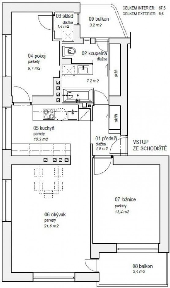 Nabízíme nezařízený byt 3+1 (68 m2) s dvěma balkony (celkem 9 m2), kompletně po rekonstrukci. Byt se nachází ve 2. patře hezkého cihlového domu. Světlé oddělen...é neprůchozí pokoje - obývák + dvě ložnice. Kuchyně na míru s pracovní deskou z masivu je plně vybavena (plynová varná deska, elektrická trouba, mikrovlnná trouba, digestoř, lednička, mrazák). K dispozici je také pračka. Podlahy v pokojích a kuchyni jsou obloženy původními renovovanými bukovými parketami, v chodbě a koupelně s sociální zařízení WC je dlažba. Vysokorychlostní internetové připojení (20 Mbit/s) v ceně nájmu. V domě je centrální vytápění a ohřev teplé vody.