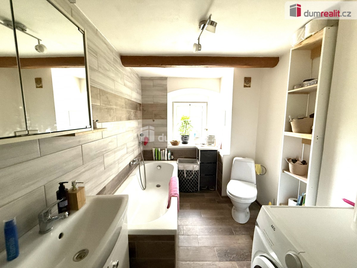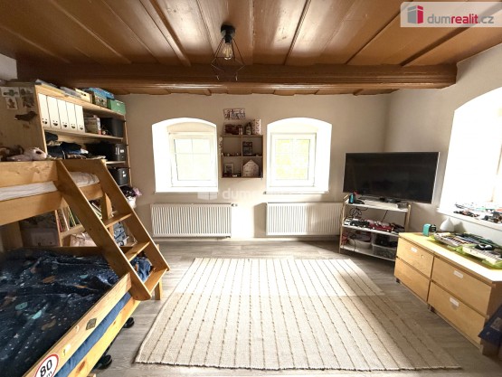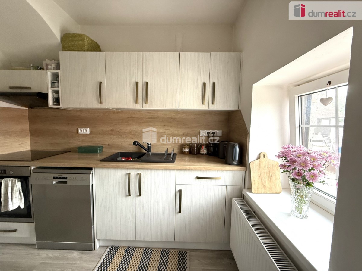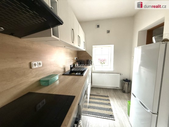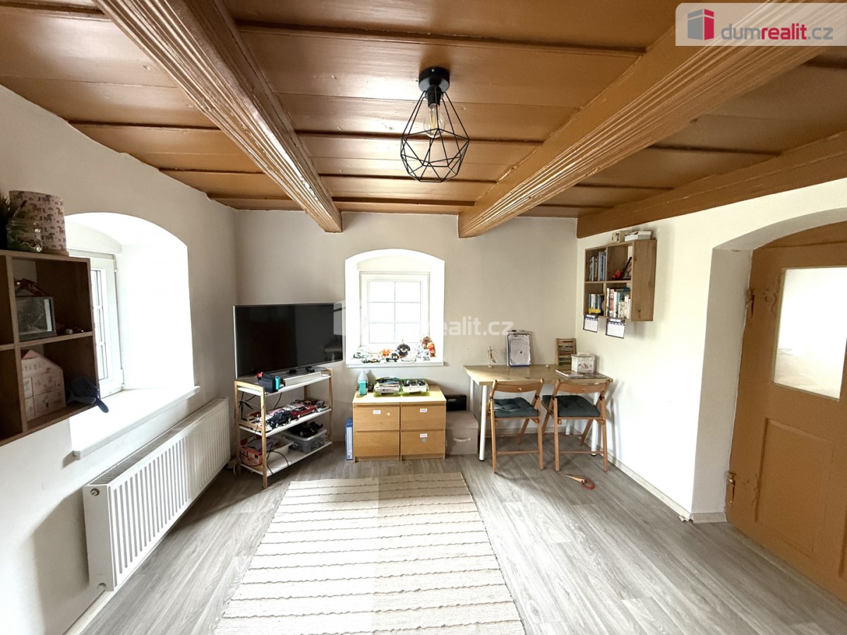 Dispozičně byt nabízí prostorný obývací pokoj vybavený krbovými kamny, samostatnou ložnici, moderně zařízenou kuchyň, koupelnu a další pokoj vhodný například jako pracovna či dětský pokoj. Vytápění je možné elektrickým topením nebo prostřednictvím krbových kamen.