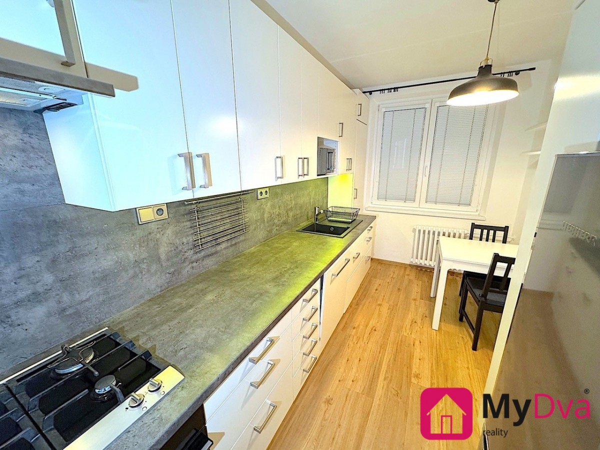 Sestává z prostorné předsíně, kuch...yně s jídelnou, velkého obývacího pokoje se vstupem na zasklenou lodžii, dvou samostatných pokojů, koupelny se sprchovým koutem a samostatné toalety. Byt je vybavený moderní kuchyní se spotřebiči a nájemník bude mít k dispozici mnoho úložných prostor ve vestavěných skříních. Velkou výhodou pro horké dny je nainstalovaná klimatizace. Byt se pronajímá nevybavený a je ihned volný k pronajmutí.