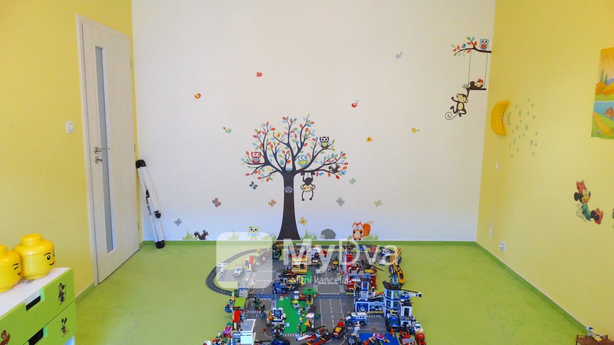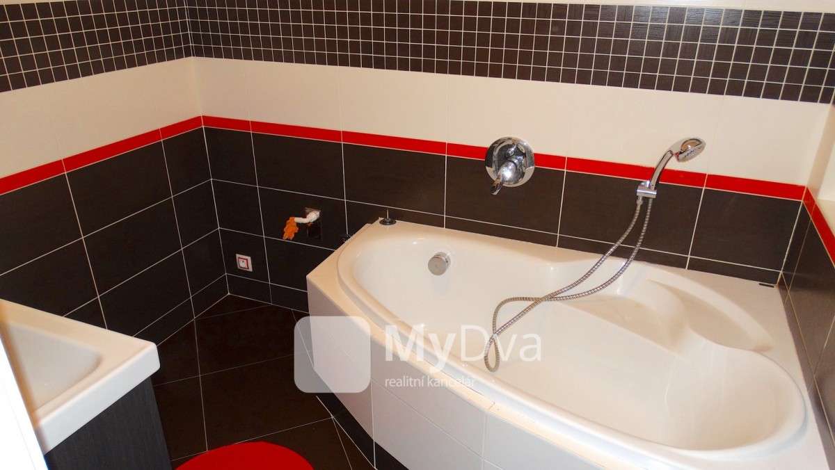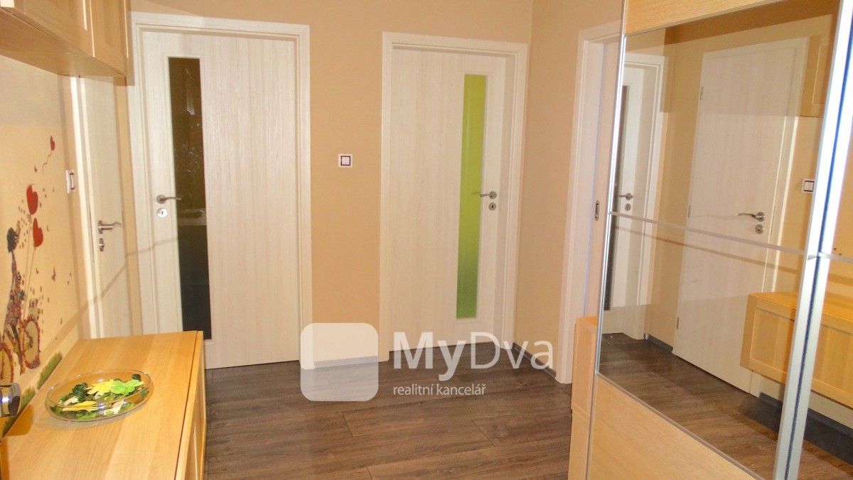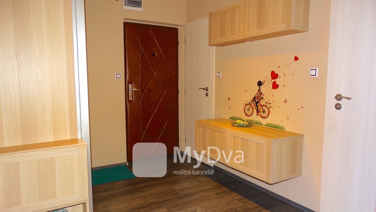 Po vstupu do bytu se ocitneme v rozlehlé předsíni, kde jsou umístěny prostorné vestavěné skříně. Z předsíně dále můžeme vstoupit na oddělenou toaletu, hned vedle do moderně zařízené koupelny s rohovou vanou, umyvadlem a přípojkou na pračku. Na protější straně předsíně nalezneme vstupy do ložnice a dále do dětského pokoje, ze kterého lze vstoupit na prostornou lodžii situovanou do klidného vnitrobloku. Posledním vstupem se dostaneme do obývacího pokoje, který je propojen s plně vybavenou kuchyní.