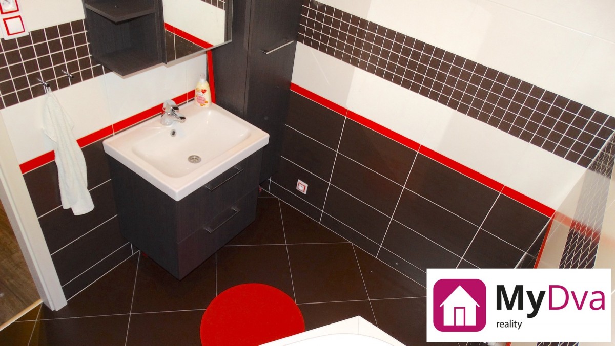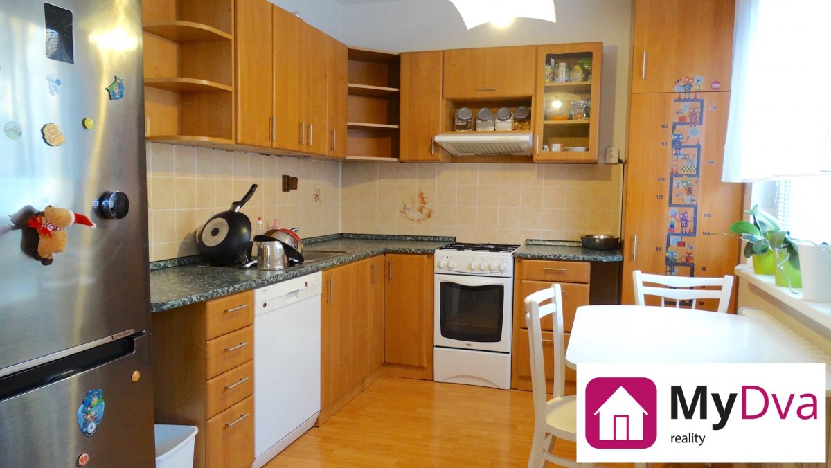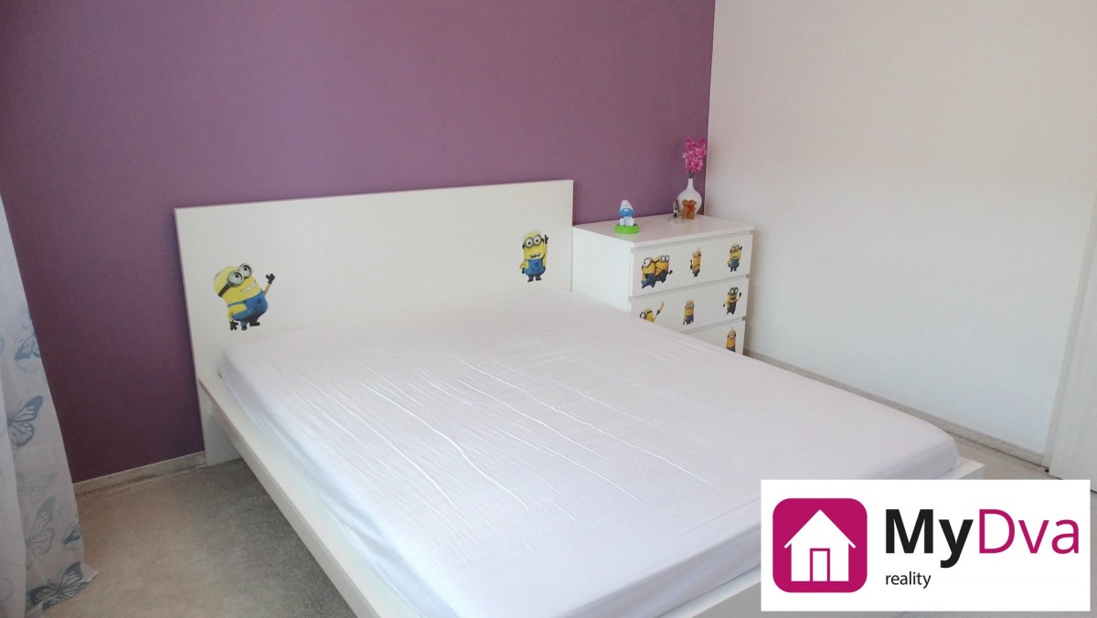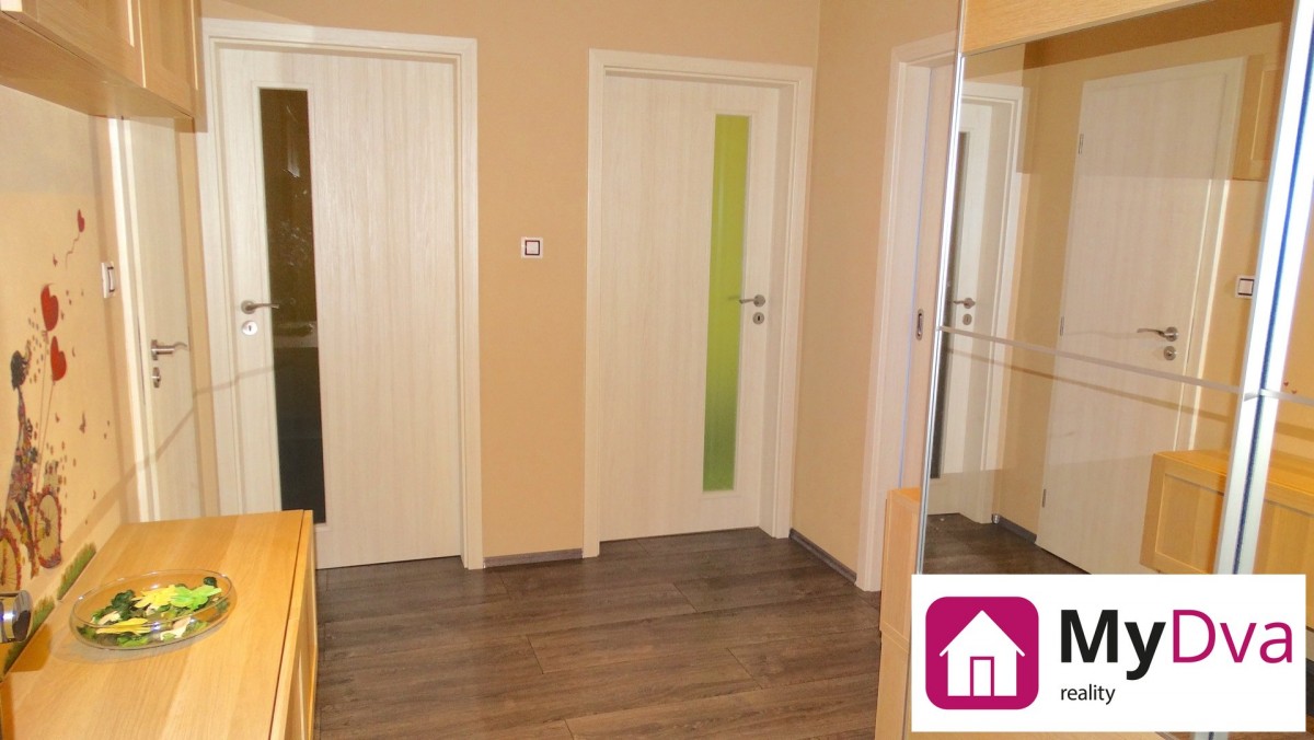 Po vstupu do bytu se ocitneme v rozlehlé předsíni, kde jsou umístěny prostorné vestavěné skříně. Z předsíně dále můžeme vstoupit na oddělenou toaletu, hned vedle do moderně zařízené koupelny s rohovou vanou, umyvadlem a přípojkou na pračku. Na protější straně předsíně nalezneme vstupy do ložnice a dále do dětského pokoje, ze kterého lze vstoupit na prostornou lodžii situovanou do klidného vnitrobloku. Posledním vstupem se dostaneme do obývacího pokoje, který je propojen s plně vybavenou kuchyní.