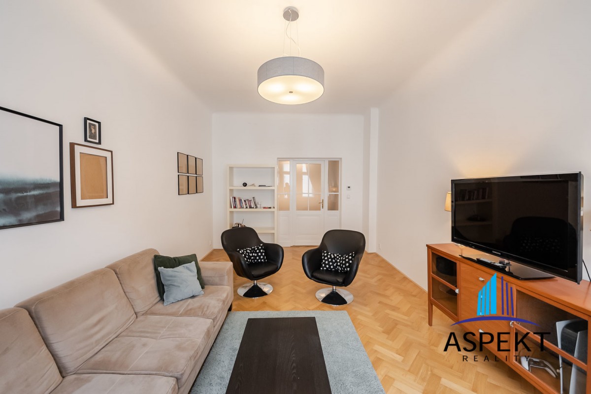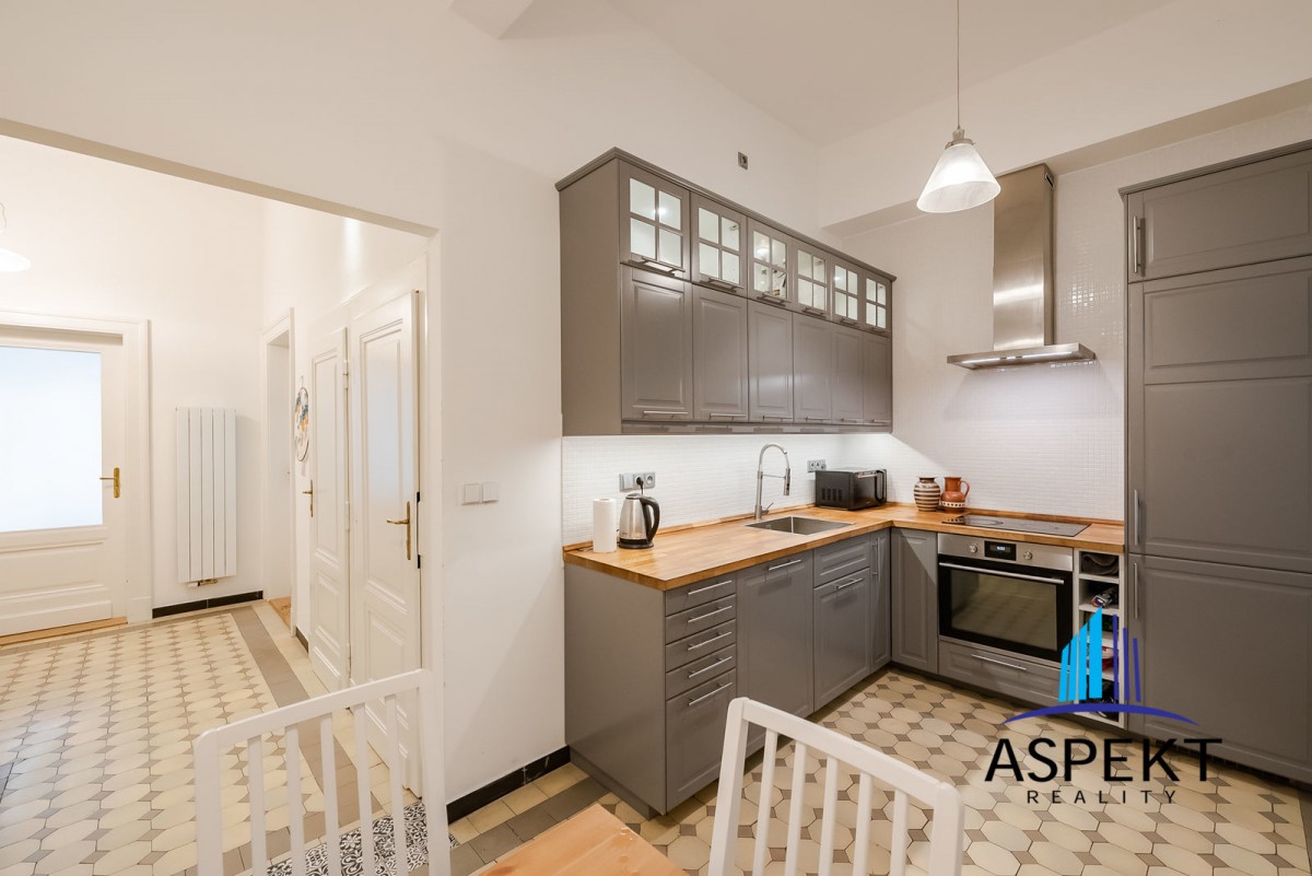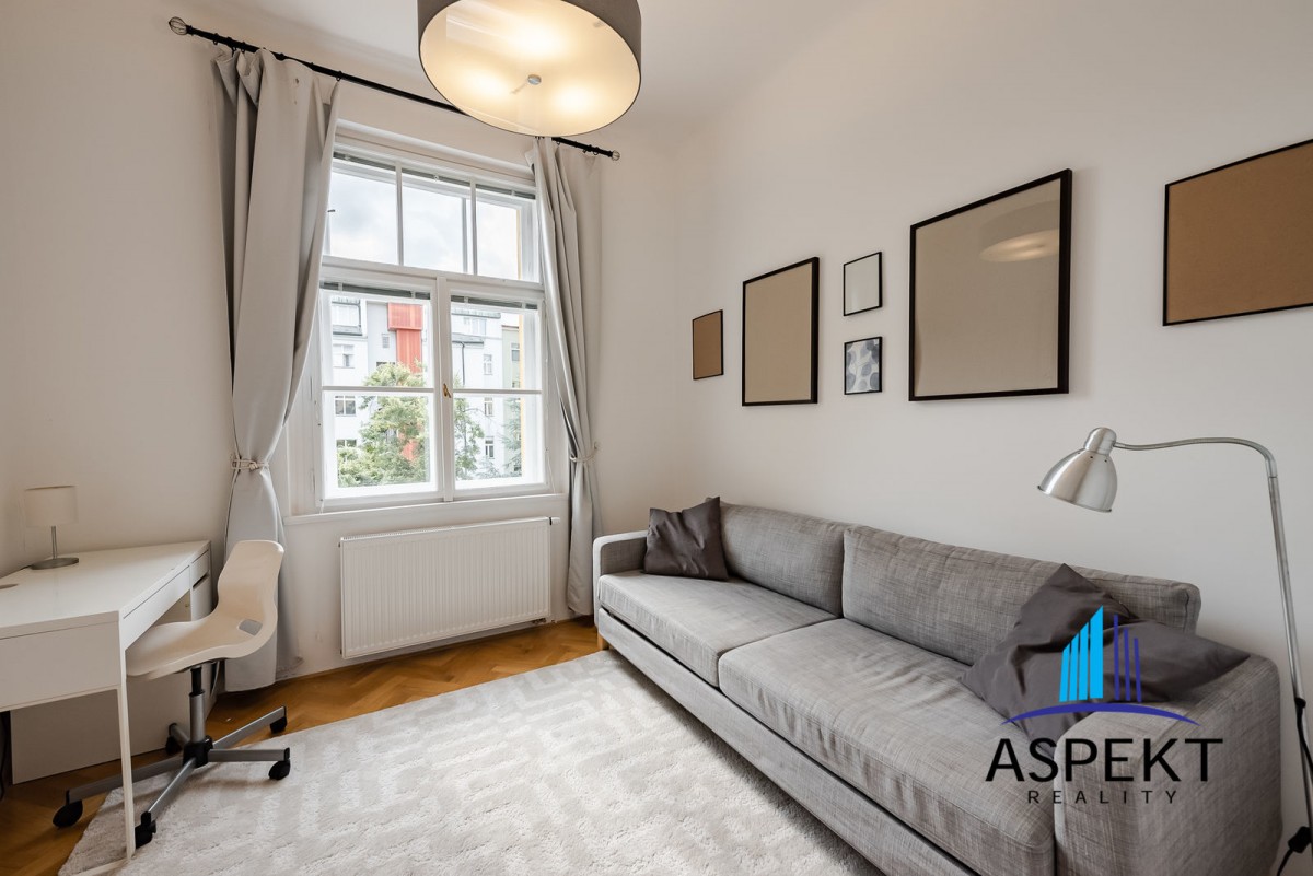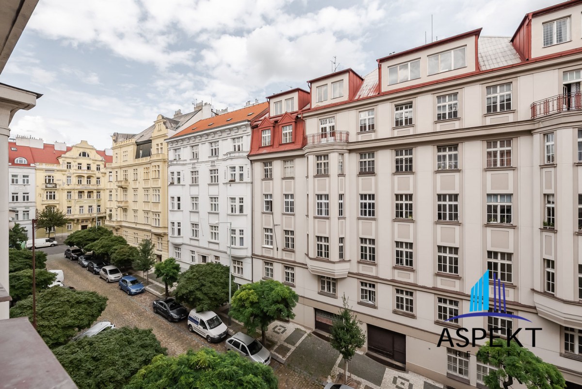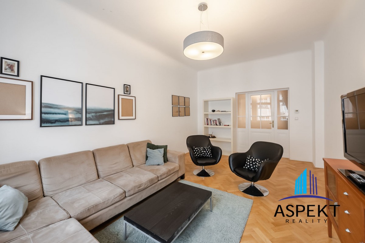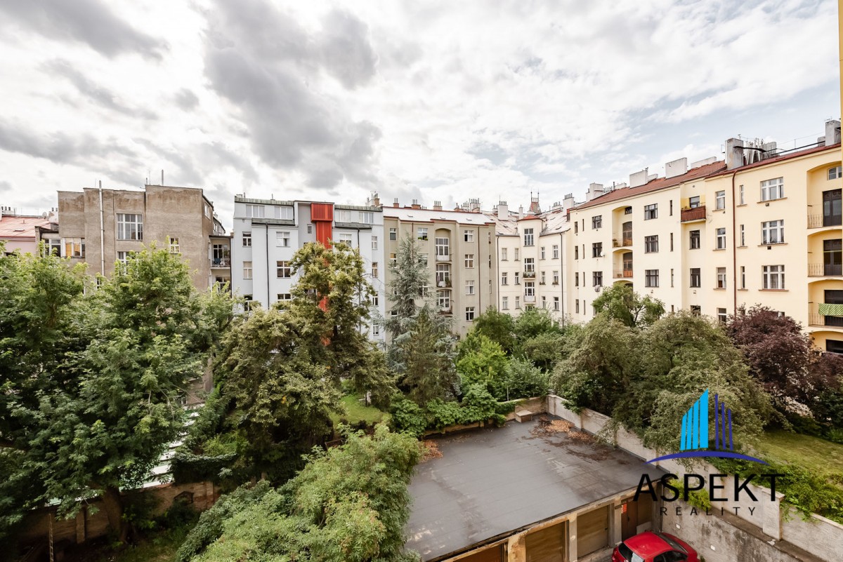 Kuchyně zařízená lednicí, elektrickou troubou, sklokeramickou deskou, myčkou a nádobím. Na podlahách parketová podlaha, dlažba, pračka, sušička, WiFi internetové připojení. K dispozici sklep. Dům se nachází v klidné ulici v rezidenční čtvrti na Vinohradech, minutu chůze od náměstí Jiřího z Poděbrad, parku Riegrovy sady a stanice metra. Perfektní lokalita v dosahu centra, s veškerou občanskou vybaveností, spousty obchodů, restaurací a kaváren.