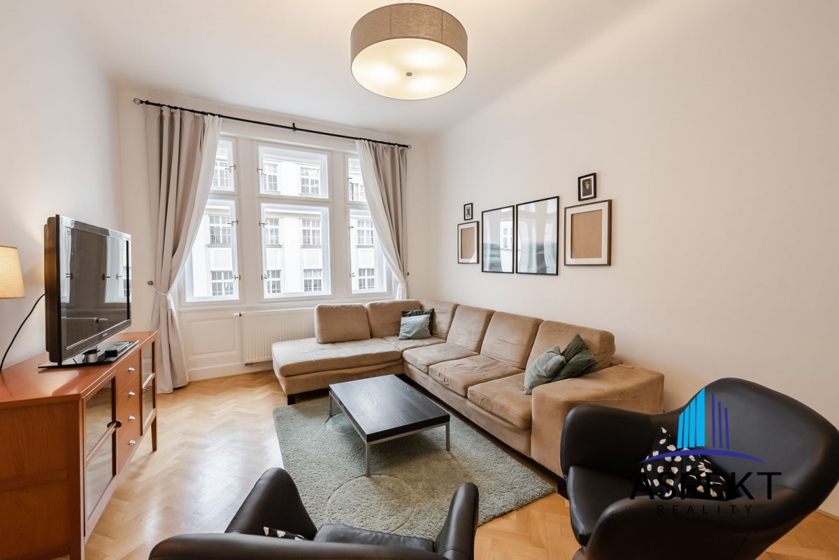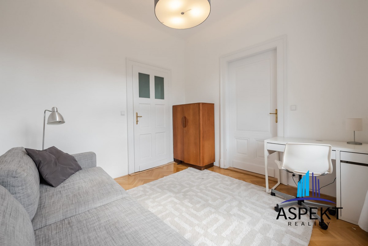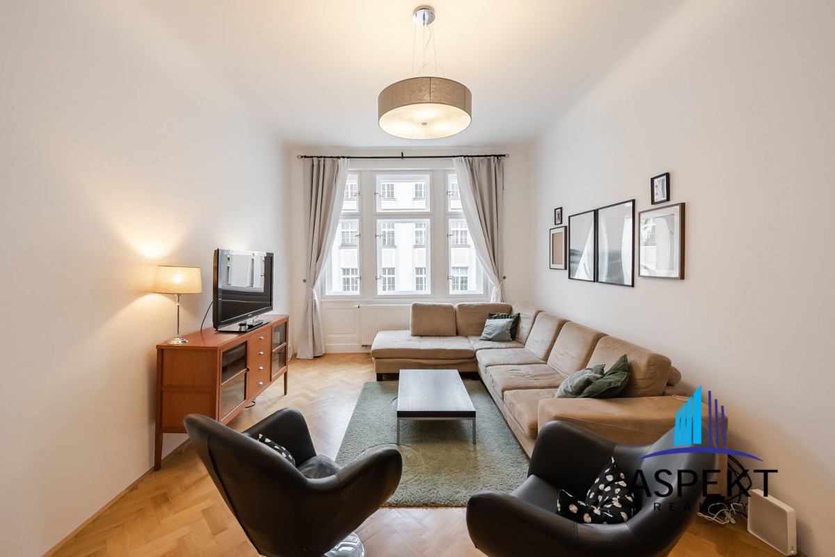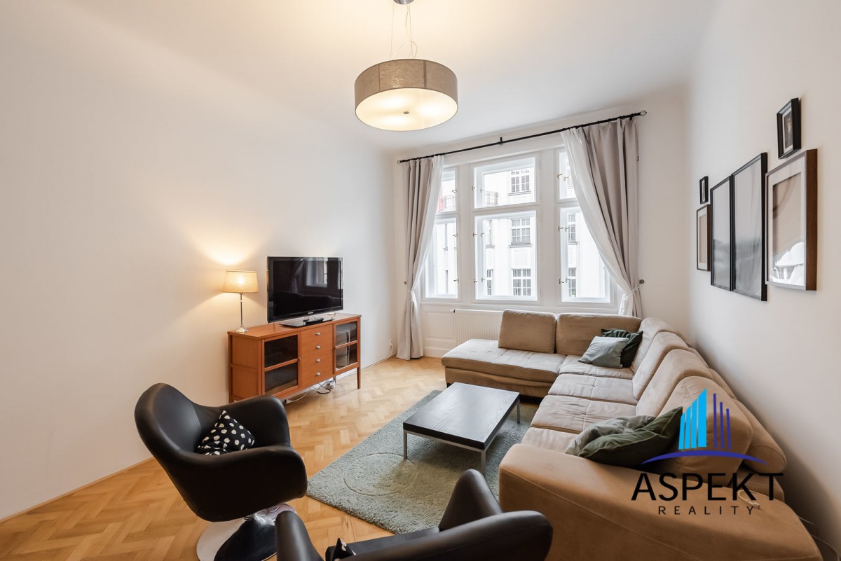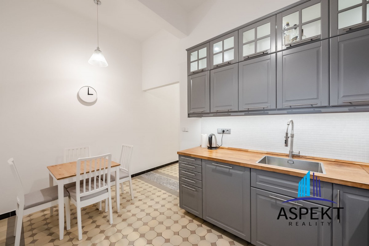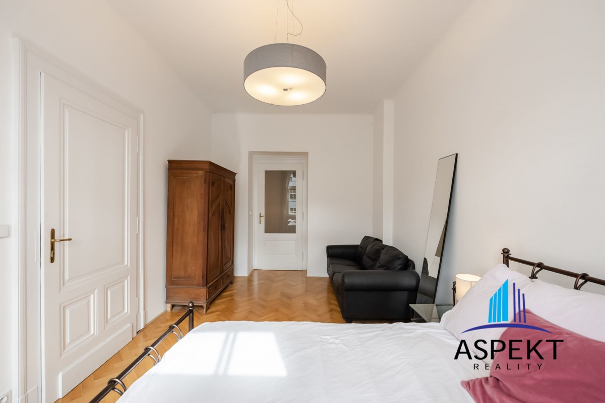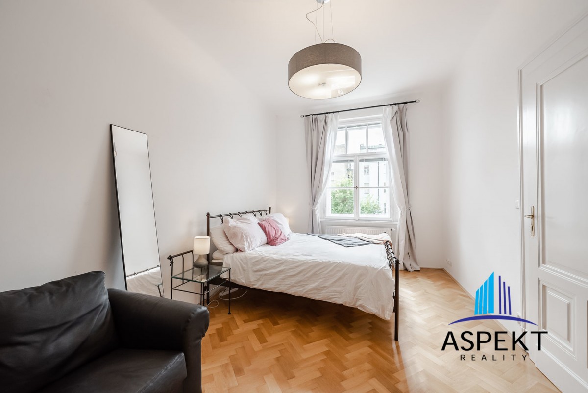 Kuchyně zařízená lednicí, elektrickou troubou, sklokeramickou deskou, myčkou a nádobím. Na podlahách parketová podlaha, dlažba, pračka, sušička, WiFi internetové připojení. K dispozici sklep. Dům se nachází v klidné ulici v rezidenční čtvrti na Vinohradech, minutu chůze od náměstí Jiřího z Poděbrad, parku Riegrovy sady a stanice metra. Perfektní lokalita v dosahu centra, s veškerou občanskou vybaveností, spousty obchodů, restaurací a kaváren.