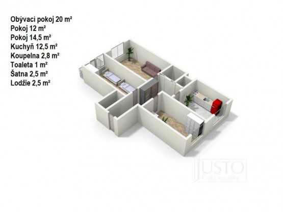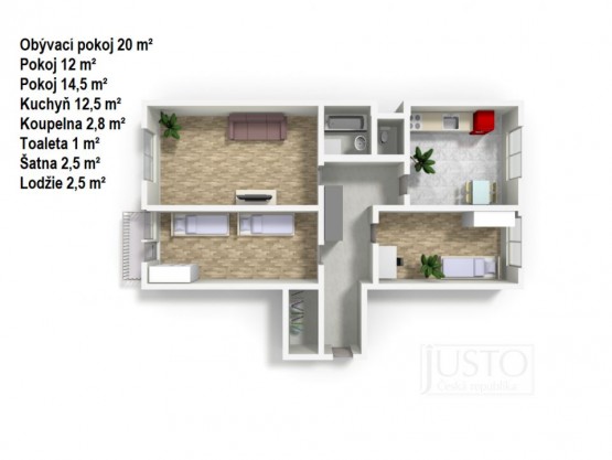 Byt je tvořen vstupní halou se šatnou, prostornou chodbou se šatní skříní, koupelnou vybavenou umyvadlem, vanou a pračkou, oddělenou toaletou, obývacím pokojem, dvěma pokoji a kuchyní s jídelnou. V bytě je dostatek úložného prostoru. Detail vybavení bytu naleznete na fotografiích.