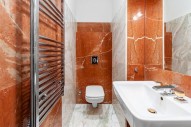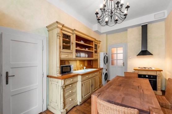 Ke kompletnímu vybavení kuchyně patří kuchyňská linka včetně spotřebičů a jídelní stůl, dále sedací souprava v obývacím pokoji, postele v ložnicích a nábytek v celém bytě. K dispozici i pračka a sušička. Podlahy parketová podlaha, předsíň a koupelny dlažba. Topení pomocí vlastního plynového kotle, případně i funkčního krbu, umístěného v obývacím pokoji. Prostorný a velice teplý byt. Z jedné strany bytu je výhled do klidné zahrady vnitrobloku a ze strany druhé na rušnou ulici kouzelných Vinohrad, plné kaváren, restaurací, barů a obchodů.