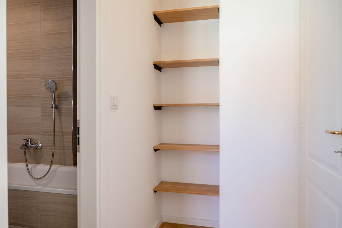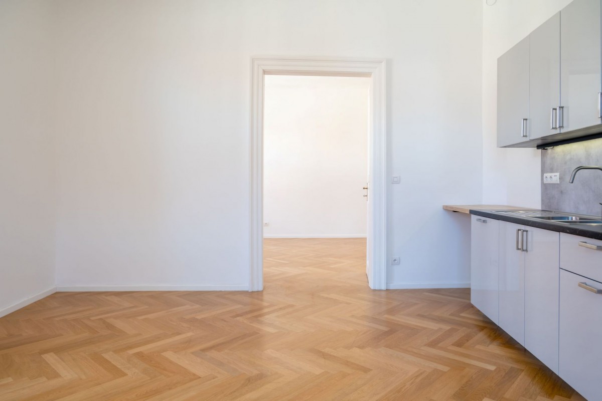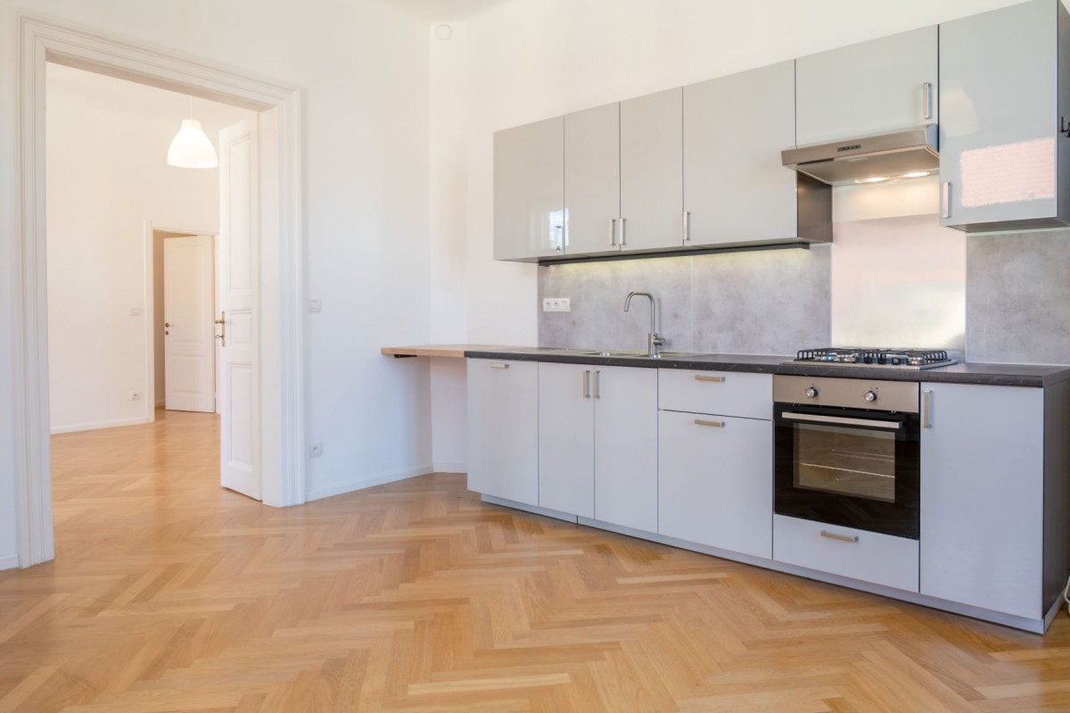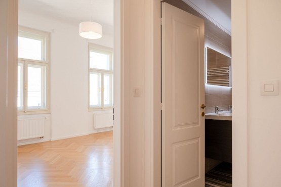Byt je po celkové rekonstrukci, působí příjemně útulně a má všechny předpoklady naplnit sen o vkusném bydlení pro rodinu. Skládá se z haly, 3 pokojů (jeden je obývací, průchozí), kuchyně s kuchyňskou linkou vybavenou spotřebiči, 2 koupelen a úklidové technické komory, kde je umístěna pračka. Vytápění a ohřev vody zajišťuje plynový kotel. V pokojích je dubová parkety s lakem v barvě medu. Bezpečnostní dveře ve stylu původních historických dveří.