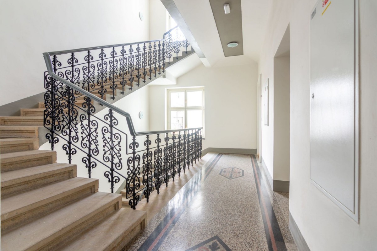 Uvítají vás působivé prostory zrekonstruovaného domu v Lublaňské ulici, na Praze 2. Na první pohled vás upoutá schodiště s původním zdobným zábradlím. V domě je moderní výtah, který zastavuje přímo na patře.