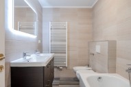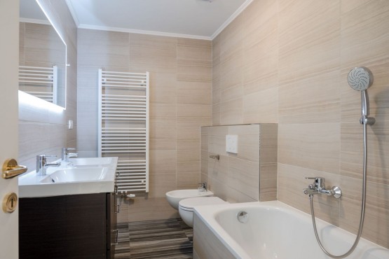 Byt ...title="3 pokoje + 1 kuchyň">3+1 má výbornou praktickou dispozici se 2 od sebe vzdálenými ložnicemi, každá disponuje vlastní koupelnou. Celková velikost 94, 5 m2 poskytuje spoustu místa a vzdušné pokoje. Umístění bytu v 5. patře zajišťuje světlost a pohledy na oblohu. Dům je rohový a tento byt kopíruje jeho rohový půdorys, což je další z mnoha kladů.