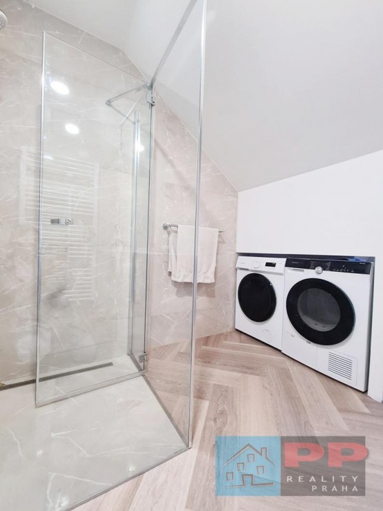 Kompletně zařízeno nábytkem a spotřebiči. Topení podlahové - t...epelné čerpadlo. V bytě jsou klimatizační jednotky. V koupelně sprchový kout, umyvadlo, pračka a sušička.