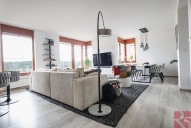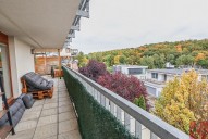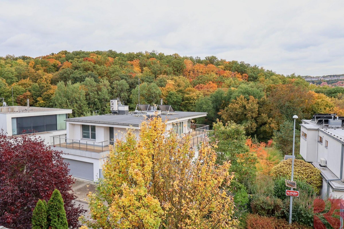 Prostorný byt se 2 koupelnami, jižně orientovanou, 35 m2 terasou a moc hezkými výhledy do okolní zeleně, situovaný ve 3. patře moderní budovy, která je součástí rezidenčního komplexu s 24/7 recepcí a ostrahou,... kamerovým systémem a dětským hřištěm.