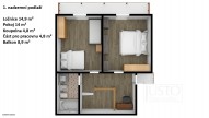 Po točitém schodišti pak vyjdete do druhého patra, které tvoří dva neprůchozí pokoje s průchozím balkonem (8, 9 m²)a bezpečnostní mříží na elektrické ovládání, koupelna a menší samostatný balkon. Ložnice je vybavena luxusní postelí značky BEDEUR, komodou a vestavěnou skříní. Ve vedlejším pokoji bude pouze skříň. Na chodbě je vytvořen prostor s pracovnou.