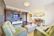 Dispozice bytu: prostorná chodba, koupelna, samostatné sociální zařízení WC, šatna, obývací pokoj s jídelní částí a plně vybaveným kuchyňským koutem se spotřebiči (sklokeramická varná deska, trouba, myčka, mikrovlnná trouba, lednice s mrazákem a nádobí), dvě ložnice, lodžie.