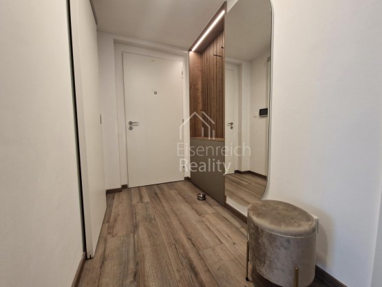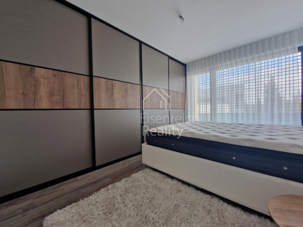 Byt je kompletně a nadstandardně zařízený ve spolupráci s designovým studiem NADTO DESIGN. Dominantou je moderní kuchyňská linka vybavená kvalitními vestavěnými spotřebiči značky De Dietrich. V ložnici se nachází vestavěná skříň na míru, postel není součastí pronájmu, vstupní chodba nabízí praktickou stěnu s věšákem a úložným prostorem. Koupelna je vybavena designovou skříňkou pod umyvadlem, zrcadlem a stylovým LED podsvícením stejně jako další prvky v bytě.