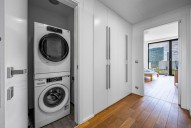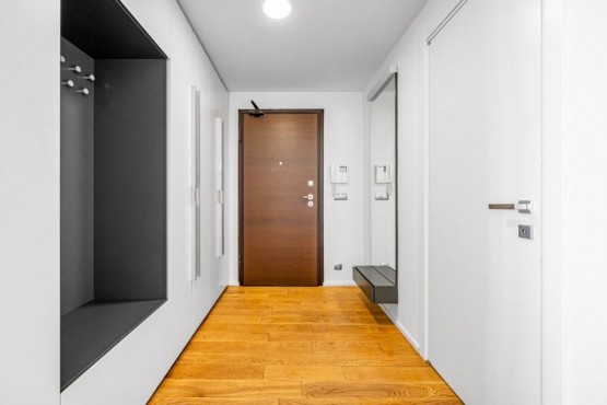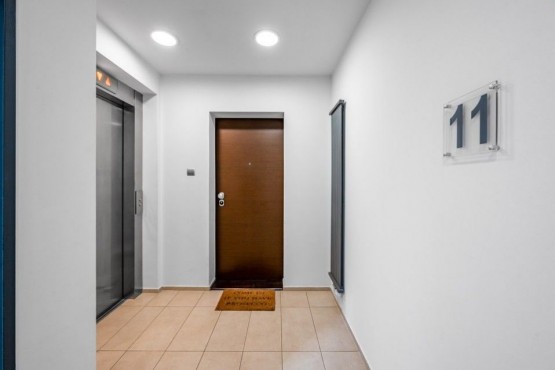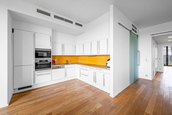 Kompletní vybavení zahrnuje kuchyňskou linku se všemi spotřebiči, vestavěné skříně a úložné prostory, dřevěné podlahy, dlažba, bezpečnostní vstupní dveře, velkoplošná a francouzská okna po celém obvodu bytu, elektrické před - okenní rolety, kompletně vybavená kuchyňská linka vybavená kuchyňskými spotřebiči, pračka, sušička, videotelefon.