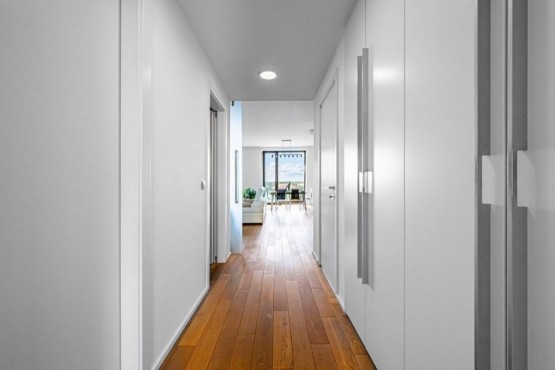 Interiér bytu tvoří otevřený prostor obývacího pokoj s jídelním prostorem, plně vybavenou kuchyní a vstupem na terasu, 2 oddělené ložnice, dále koupelna s vanou, samostatná koupelna (sprchový kout, toaleta), toaleta pro hosty zvlášť, šatna, technická komora a vstupní hala.
