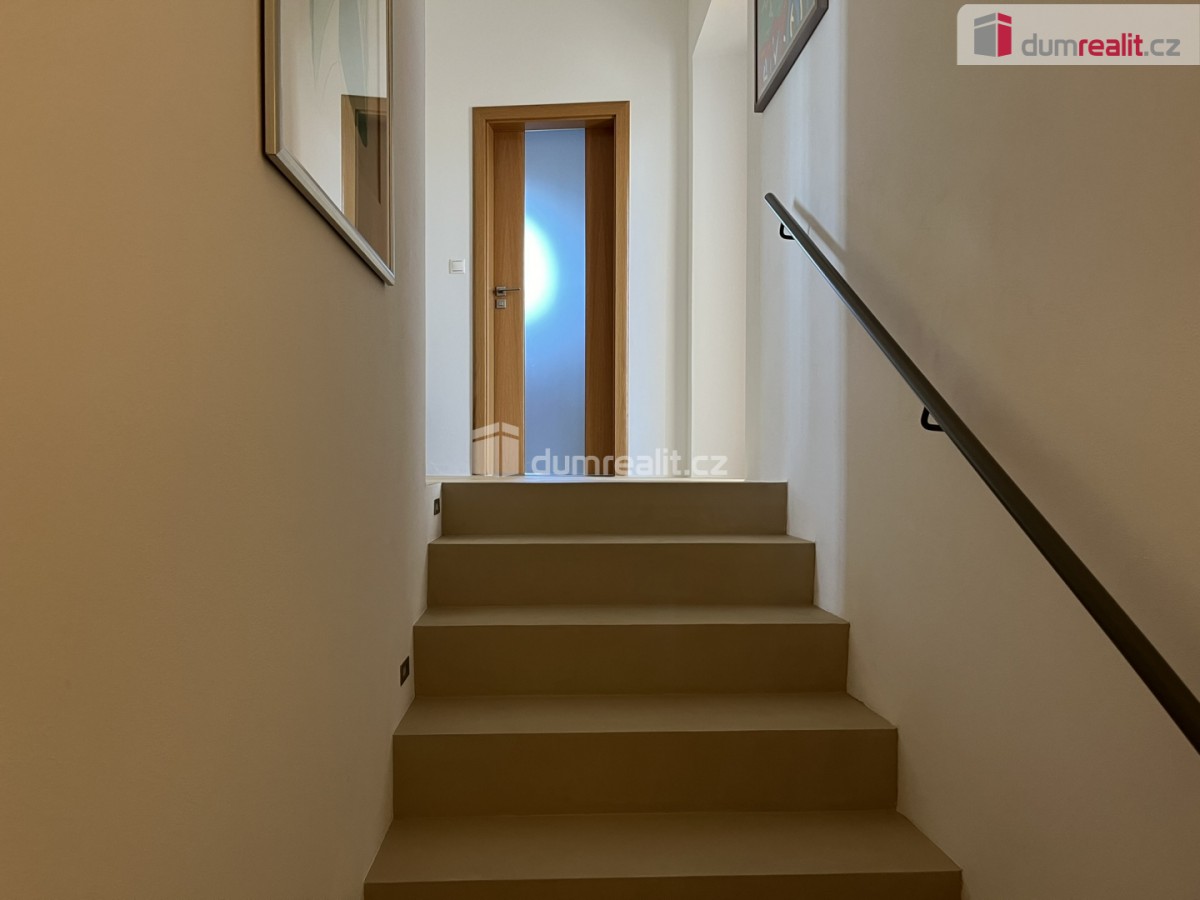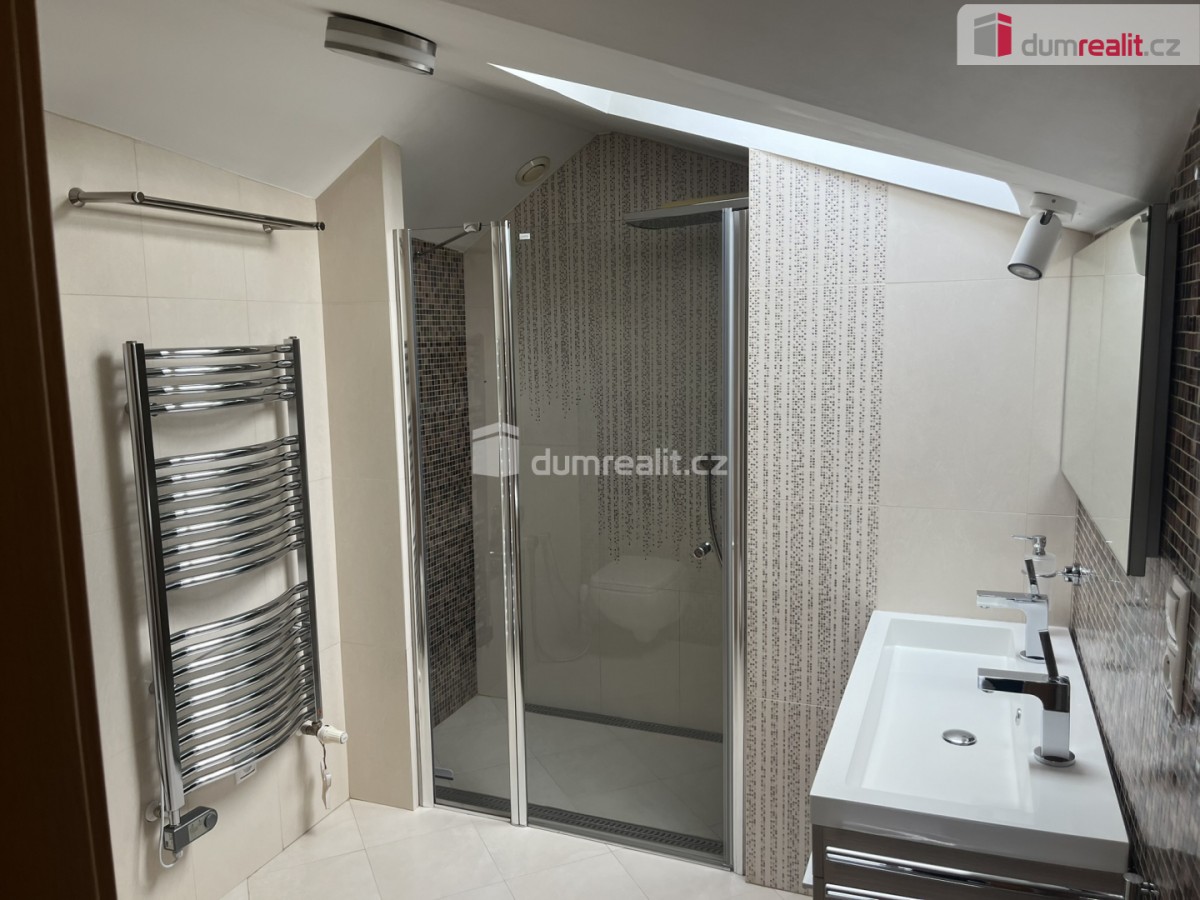 Další pokoj je přístupný z předsíně kdy se po schodech vchází do otevřeného prostoru s výrazným oknem, prostorný pokoj, který rozdělen na část s pracovnou a knihovnou a dále na další ložnici. V této části bytu je k dispozici druhá koupelna se sprchovým koutem, umyvadlem a toaletou.