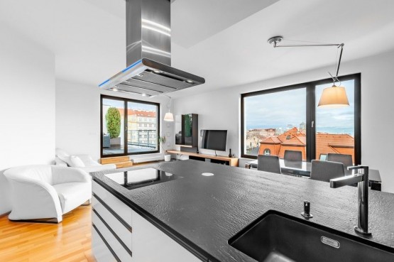 Pronájem reprezentativního, luxusního, kompletně vybaveného bytu 3+kk s parkovacím místem a s velkou terasou 76m2 s orientací na západ a s neopakovatelnými výhledy, ... situovaného ve 4. patře luxusní novostavby Rezidence Korunní na Královských Vinohradech s 24hodinovou recepcí, výtahem a upraveným vnitroblokem. Rezidence Korunní je určena všem, kteří hledají moderně řešený a luxusní byt v samém centru Prahy, na Vinohradech, v lokalitě, která je svým klidem a intimitou v bezprostřední blízkosti centra města unikátem. V dosahu veškeré občanské vybavenosti, stanice metra Flora v minutové docházkové vzdálenosti, stanice tramvají před domem.