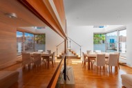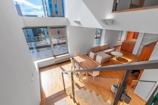 Společenská zóna bytu je tvořena otevřeným prostorem obývacího pokoje s kuchyní, jídelním prostorem a výstupem po schodišti do odpočinkové části bytu s galerií a posezením, dvěma ložnicemi s en suite koupelnou a toaletou. Zbytek dispozice zahrnuje vstupní halu a samostatná toaleta.