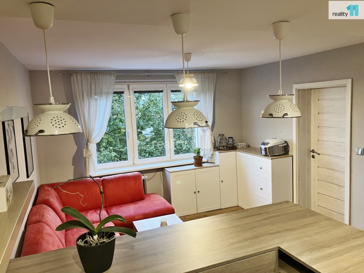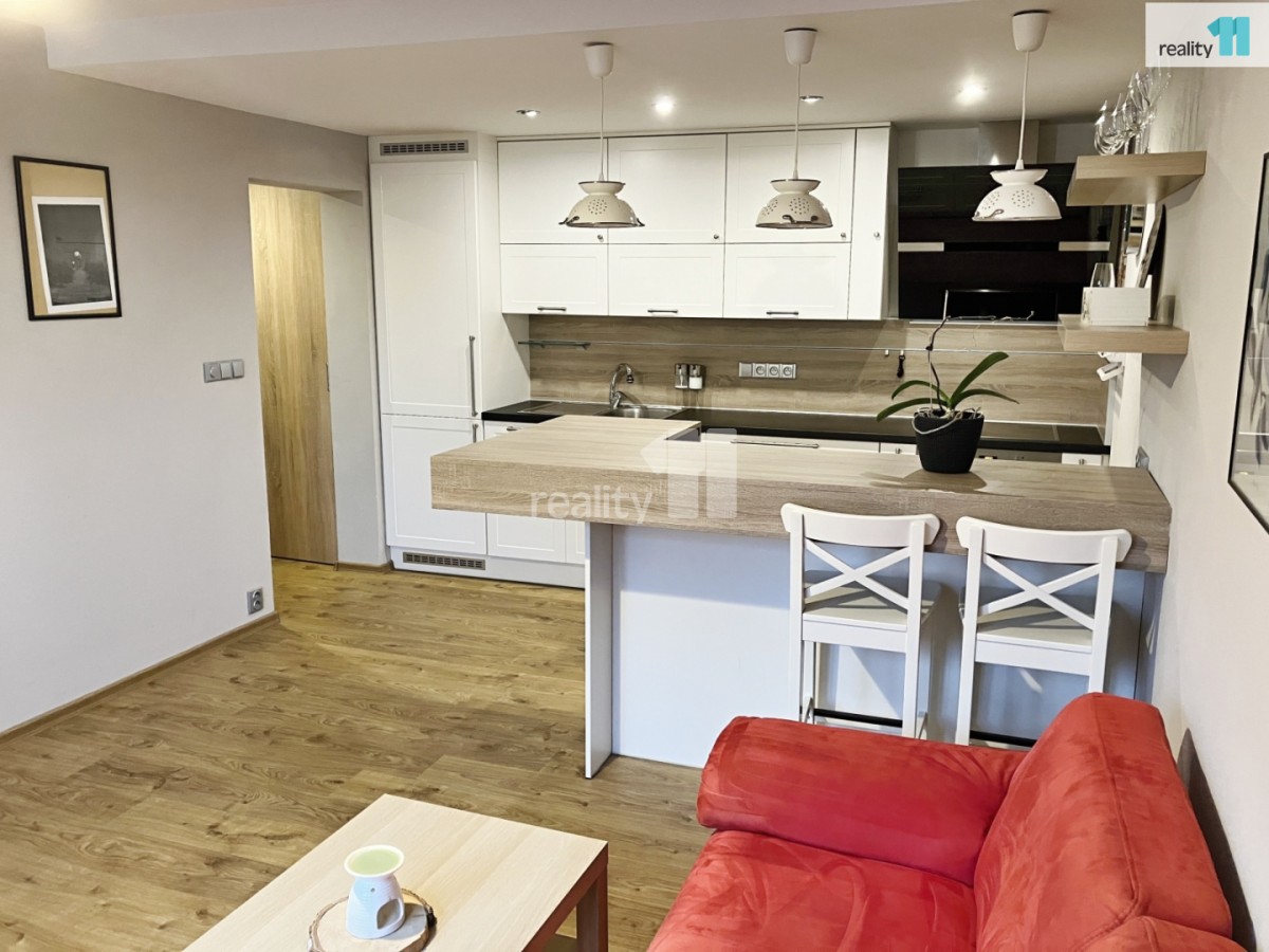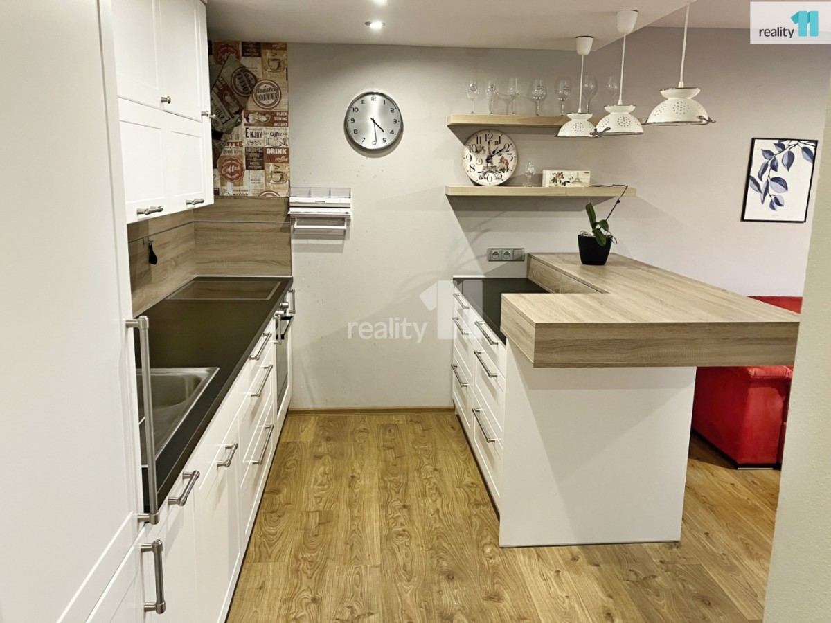 Prostorný byt prošel kompletní rekonstrukcí a změnou dispozice - nová elektroinstalace, omítky, plastová okna, podlahy, dveře, kvalitní kuchyňská linka s barovým pultem a vestav. spotřebiči (el. varná deska, el. trouba, odsavač par, myčka nádobí, lednice s mrazákem), nová kvalitně zařízená koupelna se sprchovým koutem a pračkou, samostatné sociální zařízení WC s umyvadlem, chodba s vestav. skříněmi.