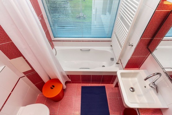 Koupelna s vanou, sociální zařízení WC. K dispozici je pračka se sušičkou. Na podlaze dlažba, plovoucí podlaha a koberce. Topení plyn. etážové.
