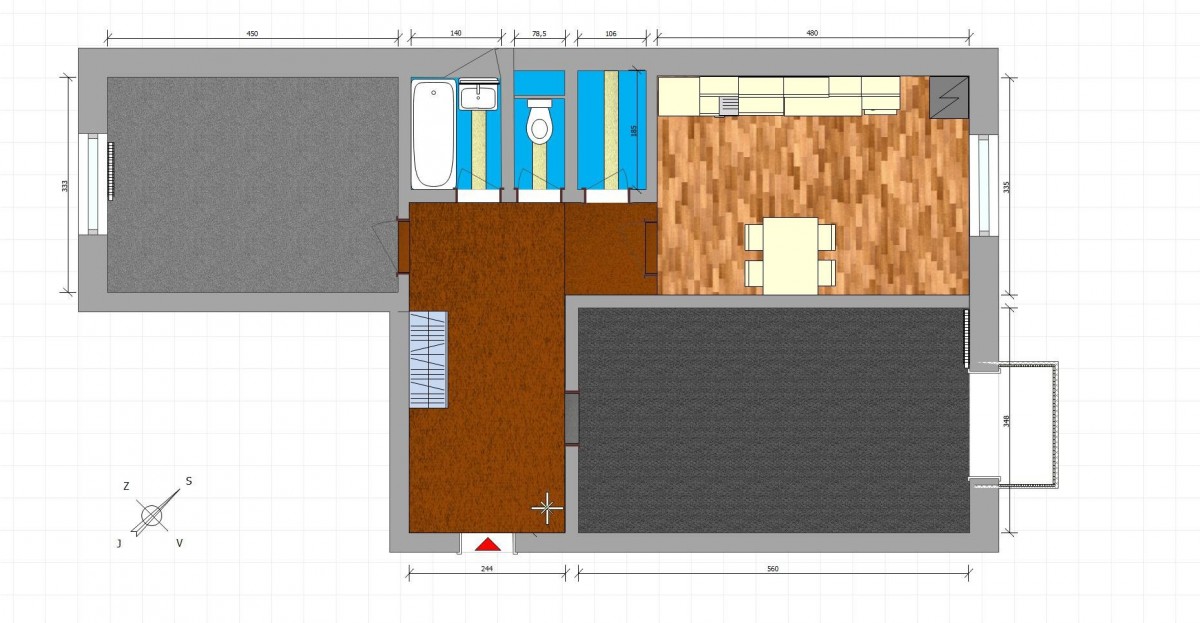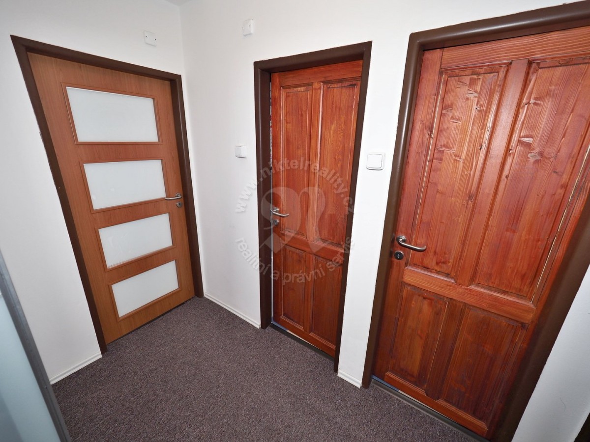 Dispozice: prostorná kuchyně s jídelnou (16 m2) s osazenou novější kuchyňskou linkou IKEA (2017), plynový sporák a místo jídelní stůl se židlemi, nové dvoudílné okno; velký neprůchozí obývací pokoj (19, 5 m2) s francouzským oknem (severovýchod) s parketami a kobercem; světlá ložnice (15 m2) s dvoudílným oknem na místní klidnou ulici (jihozápad); prostorná vstupní chodba (14 m2), ze které se vstupuje do všech uvedených místností, osazené vestavěné skříně IKEA; z chodby se rovněž vstupuje do koupelny (2, 3 m2) s osazenou hlubokou vanou a umyvadlem, nový keramický obklad stěn ve světle krémové barvě, samostatná toaleta (1, 1 m2), spíž/technická místnost přímo v bytě (2 m2). K bytu náleží zděný sklep v přízemí domu.