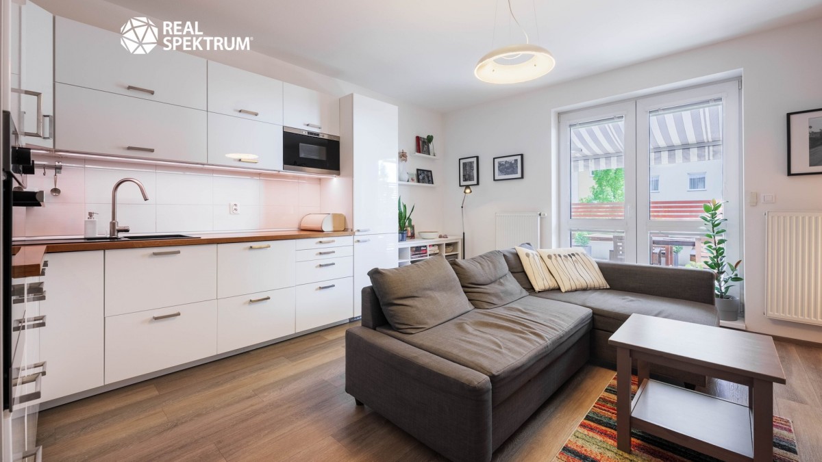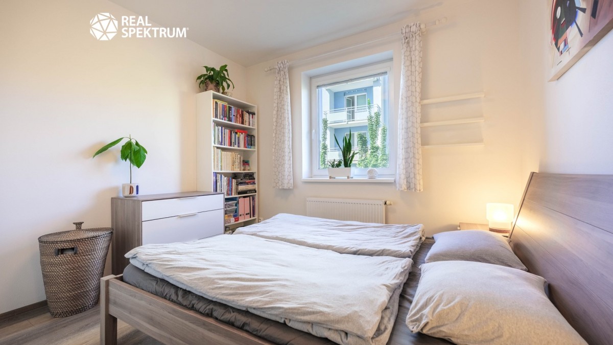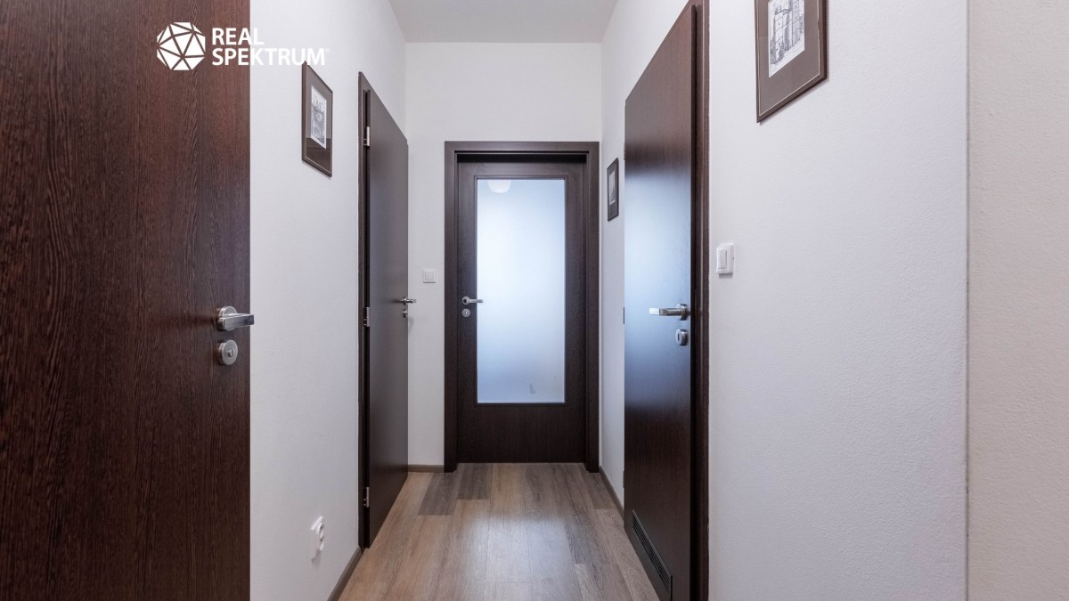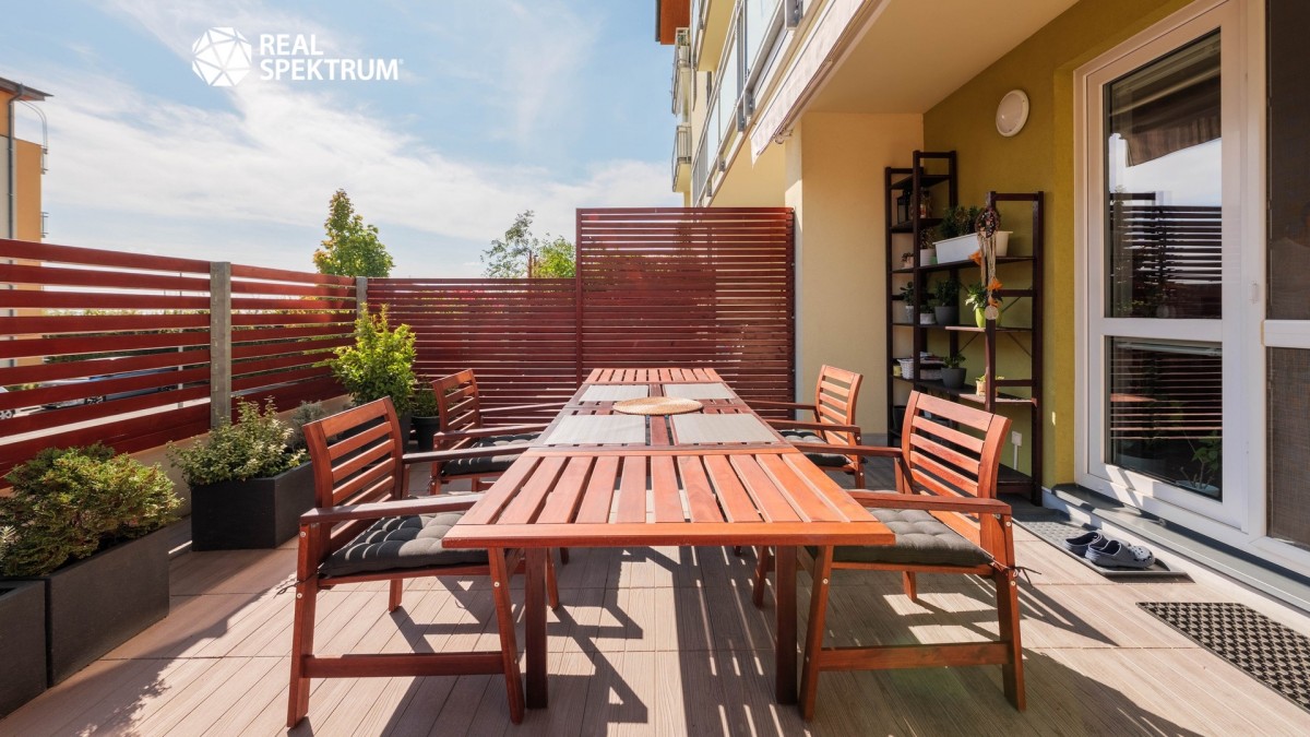 Byt je v osobním vlastnictví a má celkovou výměru 70, 9 m² včetně sklepa. Dispozici tvoří prostorná předsíň (9, 5 m²) s vestavěnou skříní, obývací pokoj s kuchyňským koutem (24, 4 m²) a přímým vstupem na terasu, dvě samostatné ložnice (12 m² a 12, 5 m²), koupelna (4, 5 m²), samostatné sociální zařízení WC (2 m²) a praktická komora (2, 8 m²). K bytu náleží sklep v suterénu domu. Podlahy jsou kombinací vinylu a dlažby a o vytápění i ohřev vody se stará vlastní plynový kotel, který zajišťuje nízké provozní náklady.
