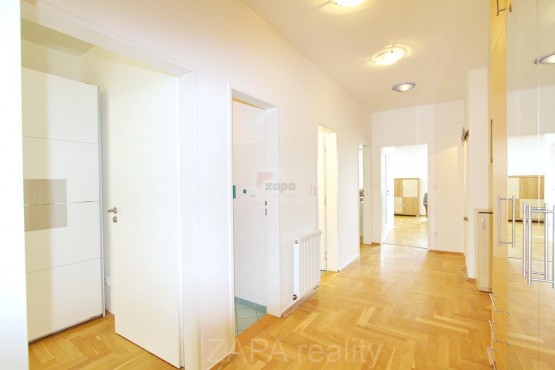 Exkluzivně nabízíme pronájem pěkného bytu 3+kk s parkovacím stáním, celková výměra bytu činí 72 m2 + 18 m2 parkovací stání v přízemí domu, Praha 3 Žižkov,... ulice Na Viktorce. Byt se nachází ve 2 patře cihlového domu z roku 2004, je zařízen nábytkem a vybavením na fotografiích (vyjma postele v ložnici) - lednice, varná deska, vestavěná trouba, mikrovlnná trouba, myčka, pračka, sušička. Po dohodě je možné část zařízení vystěhovat. V koupelně je vana a plynový kotel pro ohřev vody a topení, sociální zařízení WC je umístěno samostatně. Byt je vybaven klimatizací. Součástí bytu je komora, obývací pokoj má dva malé balkony. V pokojích jsou na podlahách parketová podlaha, v koupelně a na sociální zařízení WC dlažba. Okna kuchyňského koutu a obývacího pokoje jsou orientovaná na západ, ložnice jsou orientované na východ do klidného vnitrobloku. Všechna okna jsou s vnitřními žaluziemi. K domu náleží společná zahrada, kterou je možné užívat k posezení a grilování. Pronájem je vhodný pro max. 4 osoby - ideálně rodinu, bez psa. Měsíční nájemné činí 23. 900, - Kč + poplatky 2. 500, - Kč + el. a plyn, jistota 30. 000, - Kč, provize 23. 900, - Kč. Byt je volný ihned, dlouhodobě. V blízkosti bytu je mimo jiné park Židovské pece a základní škola Jeseniova s rozšířenou výukou sportu, Penny Market, posilovna. Zastávka autobusu Malešická je vzdálená 4 minuty chůze. Před domem je možné využít pro parkování návštěv fialovou zónu 15, - Kč/hodinu, toto parkování je v podstatě pořád volné.