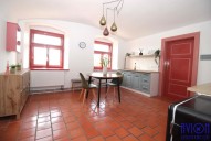 Ve velké kuchyni o rozloze 18 m2 se nachází jídelní stůl se židlemi, komoda, skříňky a dále dvoudílná velká kuchyňská linka včetně sporáku se sklokeramickou varnou deskou a lednicí. V koupelně o velikosti 9 m2 je vana, toaleta je oddělená.