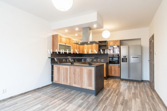 Dominantou tohoto bytu je krásná a prostorná kuchyně, kde se nabízí i možnost pro velký jídelní stůl.