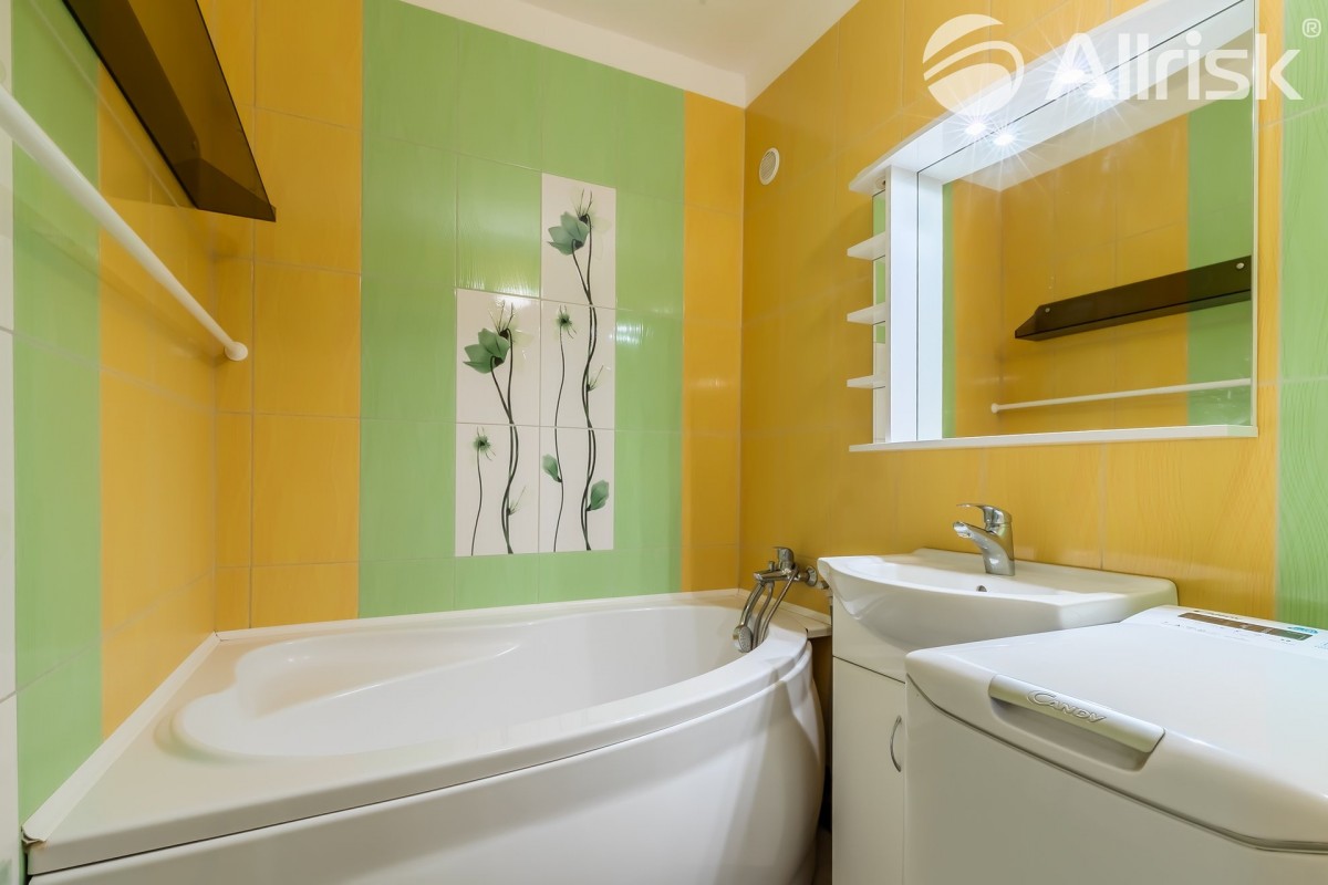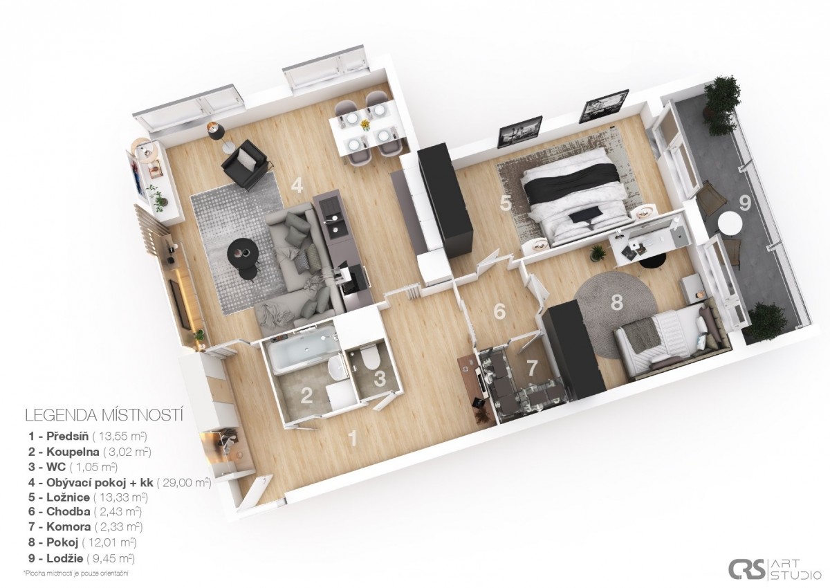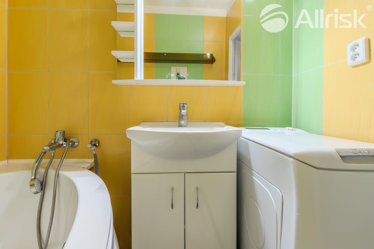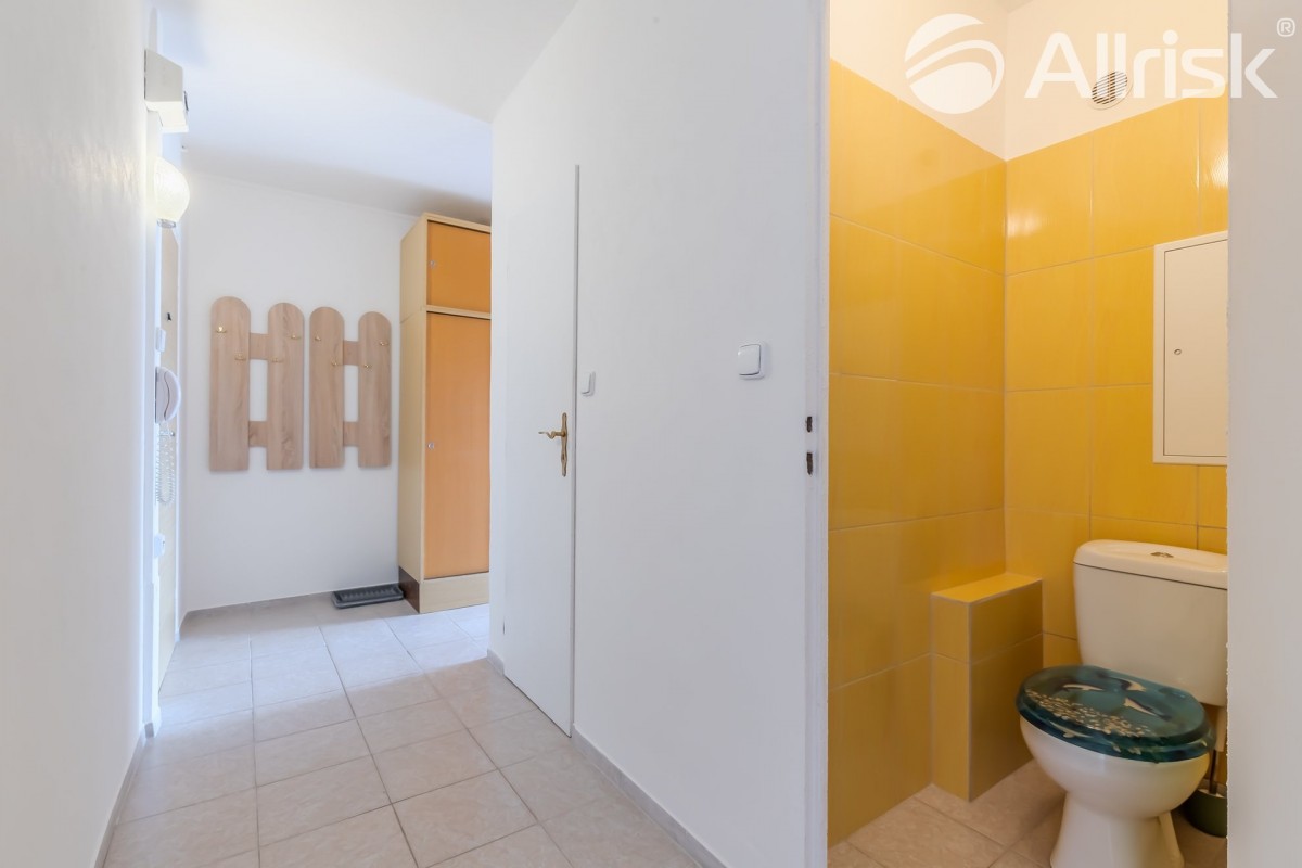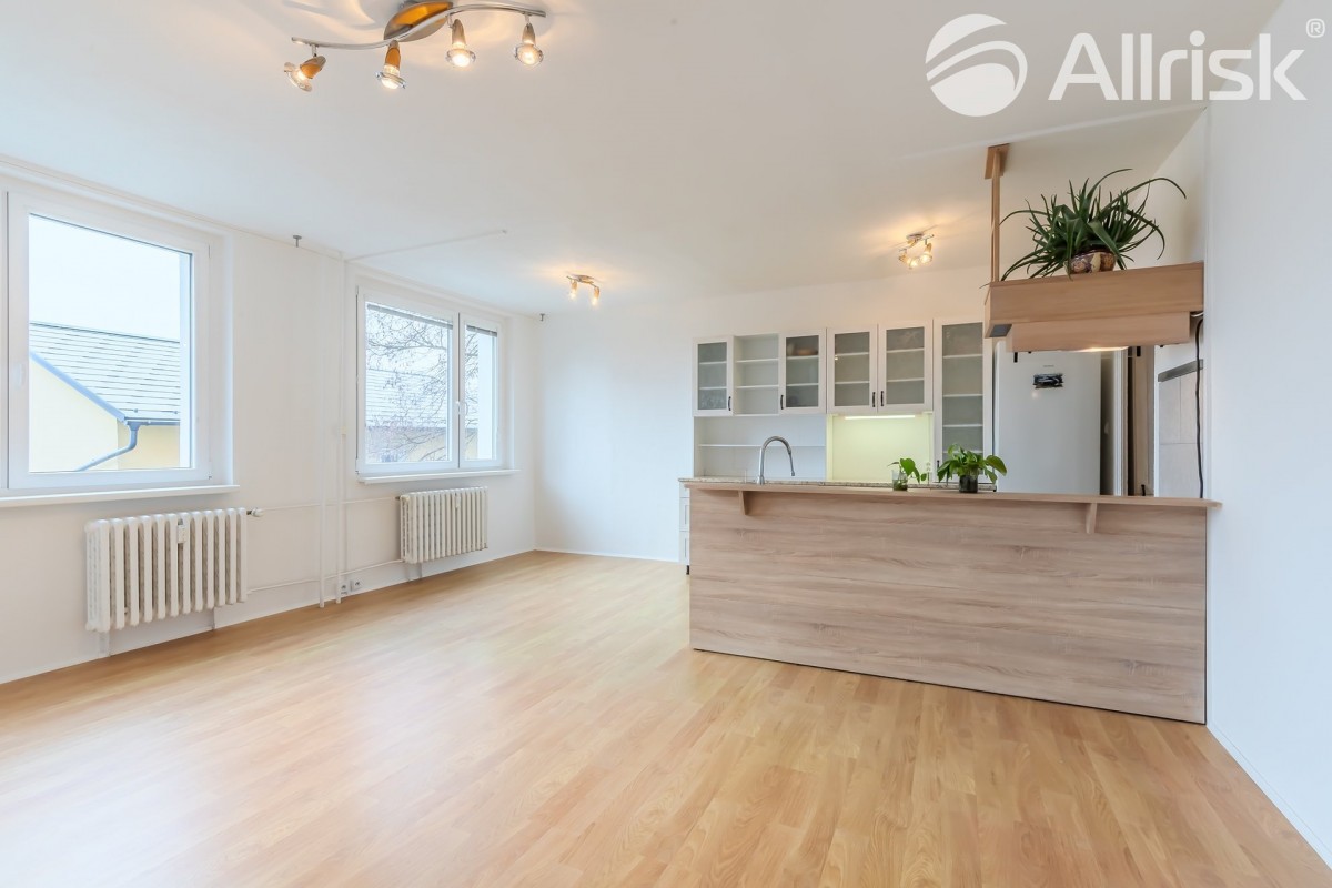 Do bytu vstoupíte do prostorné chodby, navazuje obývací pokoj s kuchyňským koutem, z chodby je přístupná koupelna s rohovou vanou, vedle je samostatné sociální zařízení WC. V bytě je praktická komora, možno využívat i jako spíž. Dál jsou zde dva samostatné pokoje, jeden z nich je se vstupem na 9, 5 m2 velkou lodžii s pěkným výhledem do zeleně.