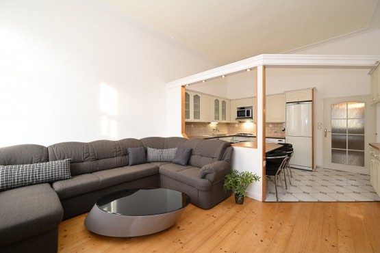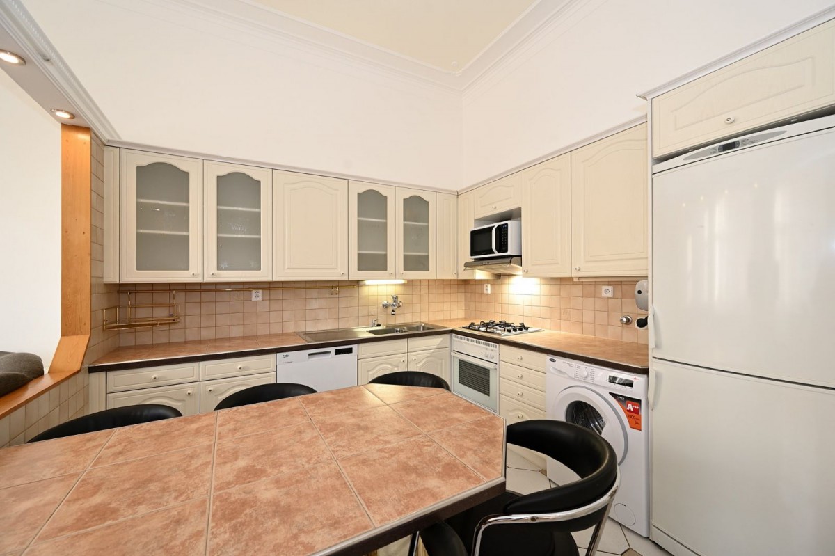Kuchyňský kout je plně vybaven spotřebiči: plynový sporák s troubou, digestoř, mikrovlnná trouba, myčka na nádobí, lednice s mrazničkou a pračka. V jednom ze dvou pokojů je k dispozici patro na spaní. Na podlaze jsou moc hezké udržované parketová podlaha, vytápění plynové etážové.