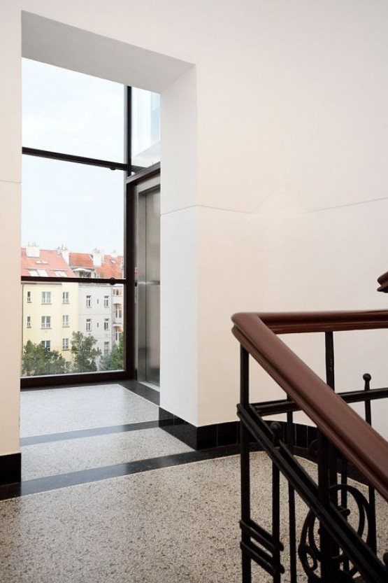 Dům je po rekonstrukci a v udržovaném stavu. K dispozici je nový výtah. Ze společné chodby je výhled do vnitrobloku plného zeleně.