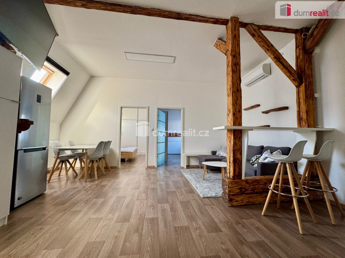 exkluzivní pronájem světlého podkrovního bytu s dispozicí 3+kk, který se nachází v domě v samotném centru města. Byt je moderně a vkusně zařízený a nabízí komfortní bydlení. Vy...tápění je řešeno plynem, v obývacím pokoji je k dispozici klimatizace. Koupelna je vybavena sprchovým koutem a závěsnou toaletou. Součástí bytu je kuchyňská linka se spotřebiči. Nábytek a vybavení zobrazené na fotografiích jsou součástí pronájmu. Nájemné je uvedeno bez energií a služeb. Nutnost složení kauce ve výši tří nájmů, jednoho nájemného + poplatek RK. Více info na dotaz u makléře nabídky. Ev. číslo: 653411. Energetický štítek: G