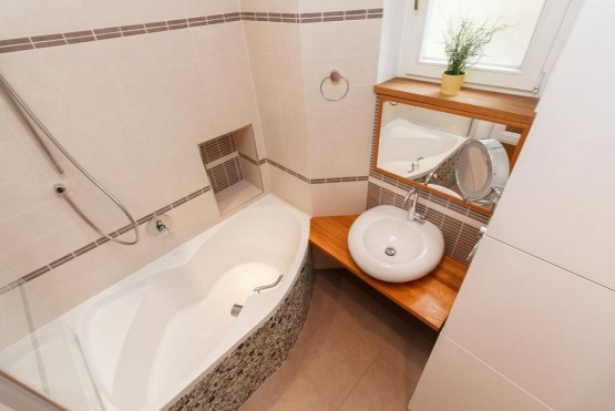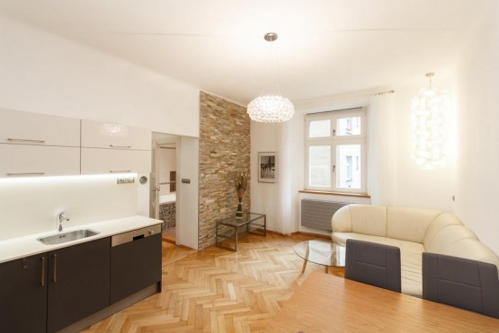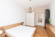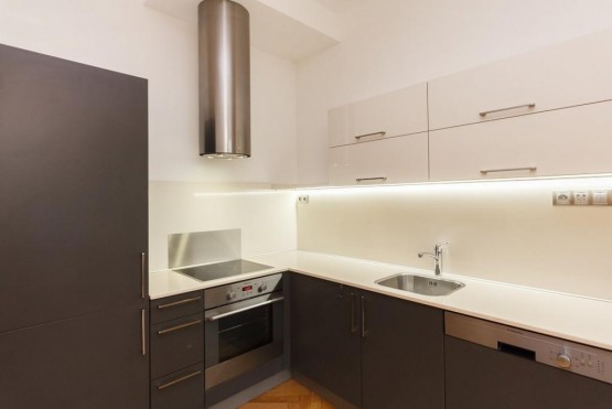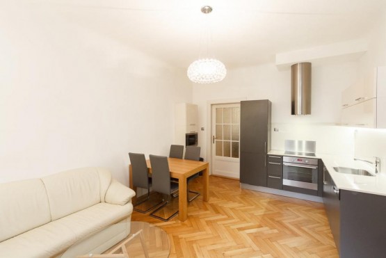 Reprezentativní, plně zařízený bytu 3+kk (82 m2) s balkonem 2 m2 k pronájmu se nachází v prvním patře cihlového zrekonstruovaného činžovního domu v klidné ...ulici se zelení v samém centru Vinohrad. V domě je nový prostorný výtah. Byt je luxusně zařízen na zakázku dělaným nábytkem. Bezpečnostní vstupní dvoukřídlé dveře. V bytě je umístěn trezor. Na podlaze jsou dubové parketová podlaha a italská dlažba. Nová dřevěná eurookna. Vytápění a ohřev vody zajištěn plynovým kotlem Junkers. Kuchyně luxusní na míru vyráběná kuchyňská linka se spotřebiči Elektrolux a pracovní deskou z umělého kamene Technistone. Koupelna - sanita od firmy Villeroy and Boch, rohová vana se sprchovým koutem, sprchová hlavice Hansgrohe raindance, zabudované koupelnové rádio. Toaleta sanita od firmy Villeroy and Boch, součástí je bidetová sprcha a umyvadlo.