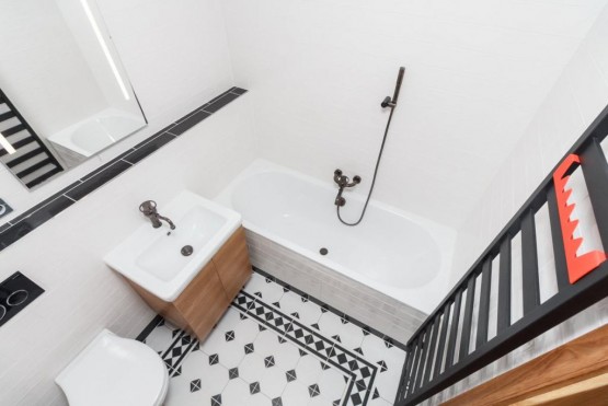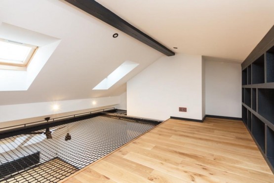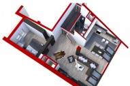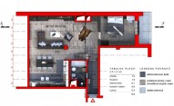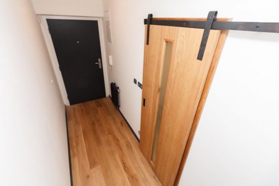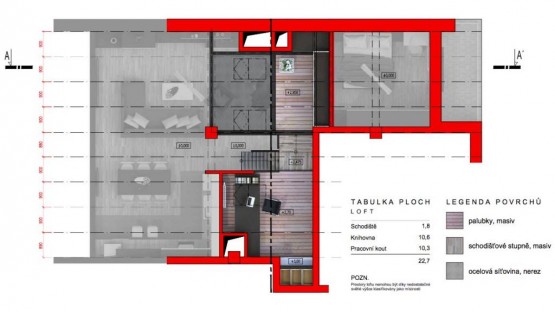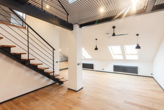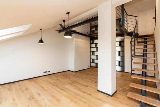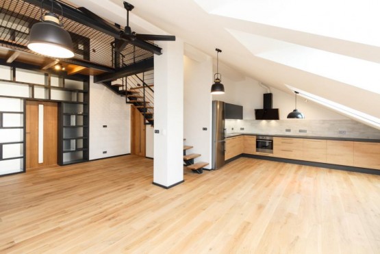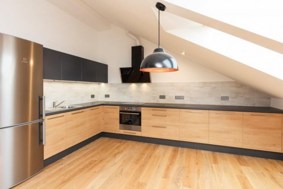 Byt je nově zrekonstruovaný a jsou v něm použité kvalitní materiály a designové prvky. Částečně mezonetový byt sestává ze vstupní haly, prostorného obývacího pokoje s kuchyňskou linkou vybavenou vestavěnými spotřebiči včetně myčky nádobí a pračky se sušičkou, dále z ložnice se vstupem na balkon a z podkrovní části vhodné k využití jako kancelář a relaxační zóna. Koupelna je vybavená vanou i sprchovým koutem. V ložnici je vestavěná skříň a v obývací části jsou vestavěné police, které tvoří zeď ložnice. Vytápění bytu je ústřední.
