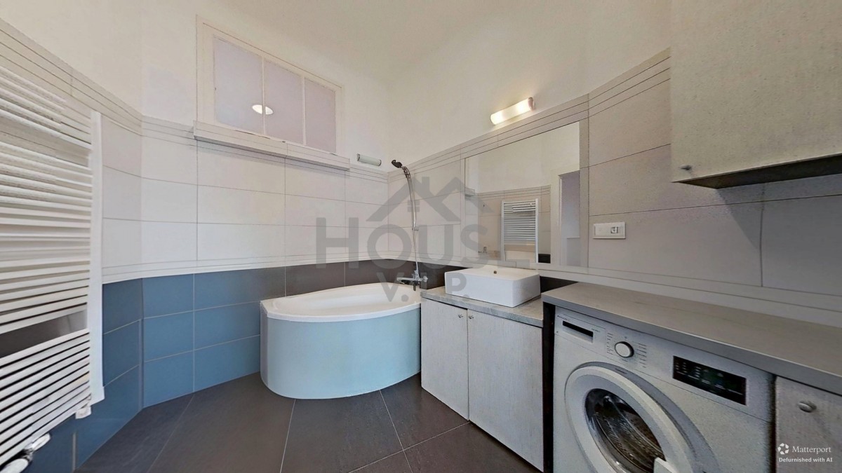 Byt se nabízí s plně vybavenou kuchyňskou linkou se zabudovanými spotřebiči - lednice, myčka, mikrovlnná trouba, digestoř, plynová trouba a sporák. V prostorné koupelně s rohovou vanou je umístěna pračka. sociální zařízení WC je samostatné.