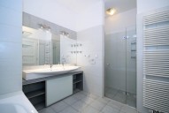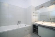 V koupelně je dvojumyvadlo se skříňkou, vana, sprchový kout a pračka.