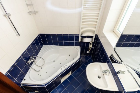 Kompletně vybavená kuchyně (lednice, mraznička, sklokeramická deska, trouba). Koupelna s velkou rohovou vanou, toaletou a pračkou. Velké plus bytu je velké francouzské okno v kuchyni s obývací částí. K dipsozici je také komora.