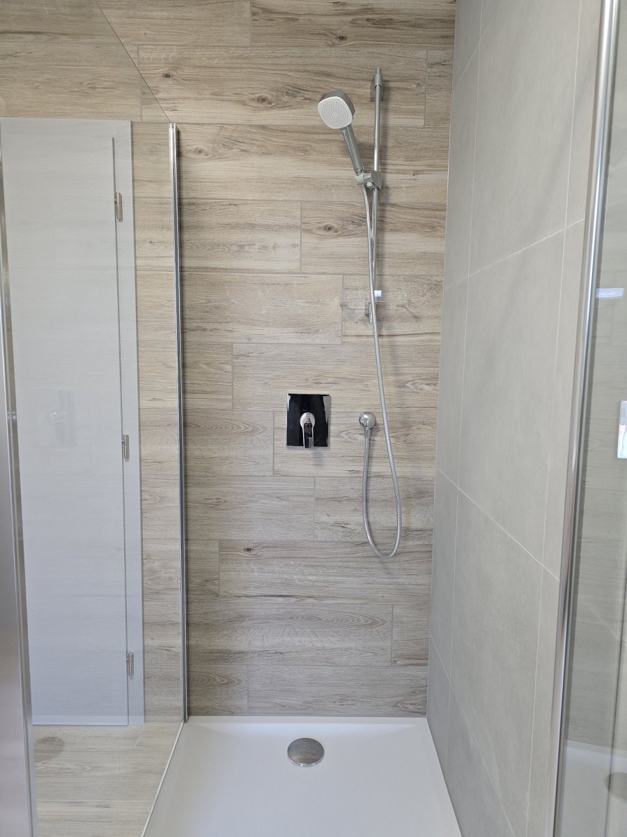 Do dětského pokoje a obývacího pokoje se vstupuje samostatně, pokoje nejsou průchozí a zajišťují tak potřebnou míru soukromí. Do ložnice se prochází z obývacího pokoje. V koupelně se sprchovým koutem a umyvadlem a toaletou je osvětlené zrcadlo, na stěně je umístěn topný žebřík a prostor pro umístění pračky. V celém bytě jsou svítidla.