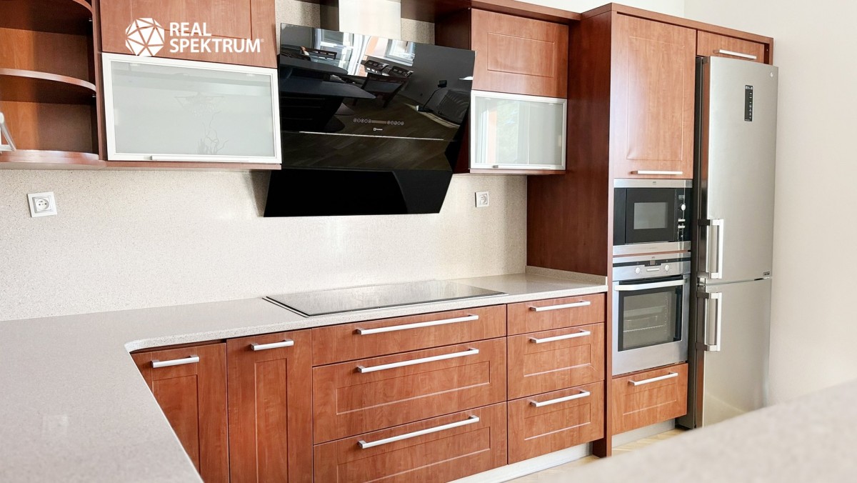 Interiér je kompletně vybaven kvalitním nábytkem a spotřebiči, včetně vestavěných skříní, které poskytují dostatek úložného prostoru. Kuchyně je funkčně i esteticky promyšlená a nabízí vše potřebné pro pohodlné vaření. Samostatná koupelna s vanou a oddělené sociální zařízení WC přispívají k maximálnímu komfortu. Předokenní žaluzie zajišťují klid a tepelnou pohodu i v horkých dnech.