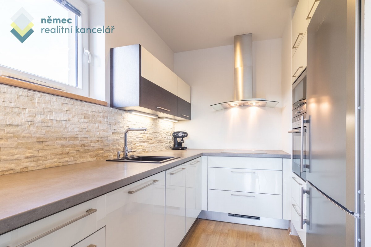 Kuchyňská linka zn. Sykora je vybavena zabudovanou lednicí s mrazákem, elektrickou troubou i indukční varnou deskou, digestoří i myčkou. V prostorné koupelně najdete kromě sanity i pračku.