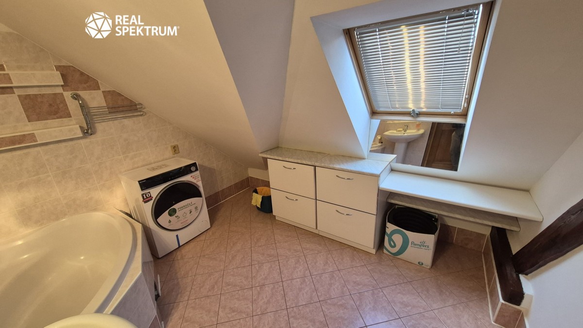Součástí bytu je také komora s velkým mrazákem, koupelna s vanou, umyvadlem a pračkou a oddělená toaleta.