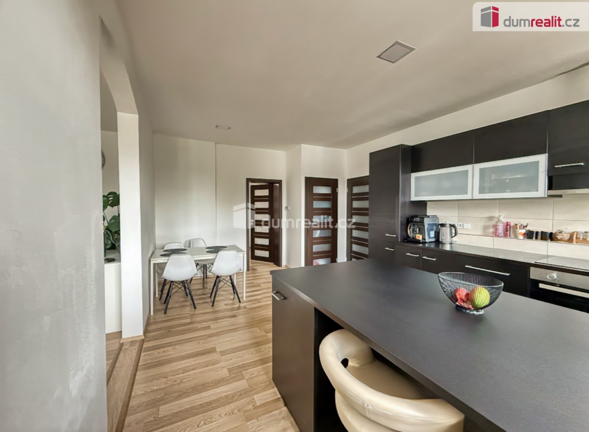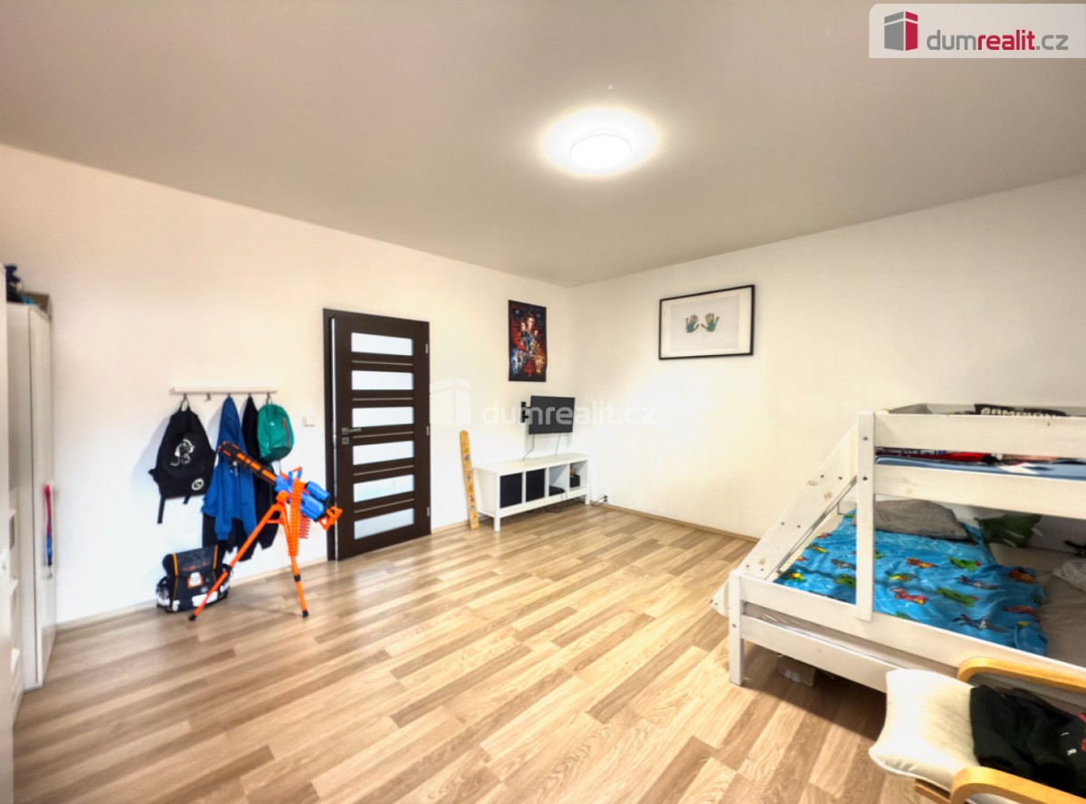 V bytě se nachází vstupní předsíň, koupelna se srpchovým koutem, obývací část s prostornou kuchyní a jídelnou, obývací pokoj, ložnice a dětský pokoj.