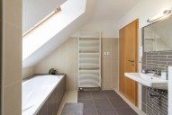 V prvním patře je ložnice se samostatnou šatnou, vstup na terasu, koupelna s vanou a sociální zařízení WC.