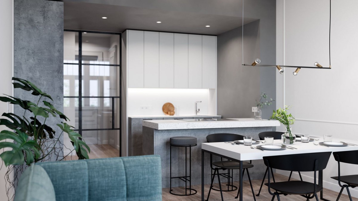 Dispozice bytu: obývací pokoj s kuchyní a jídelním prostorem, hlavní ložnice s koupelnou, druhá ložnice se šatnou, koupelna s vanou, technická místnost, komora, toaleta zvlášt a hala. Kuchyňský kout je plně vybaven moderními spotřebiči.