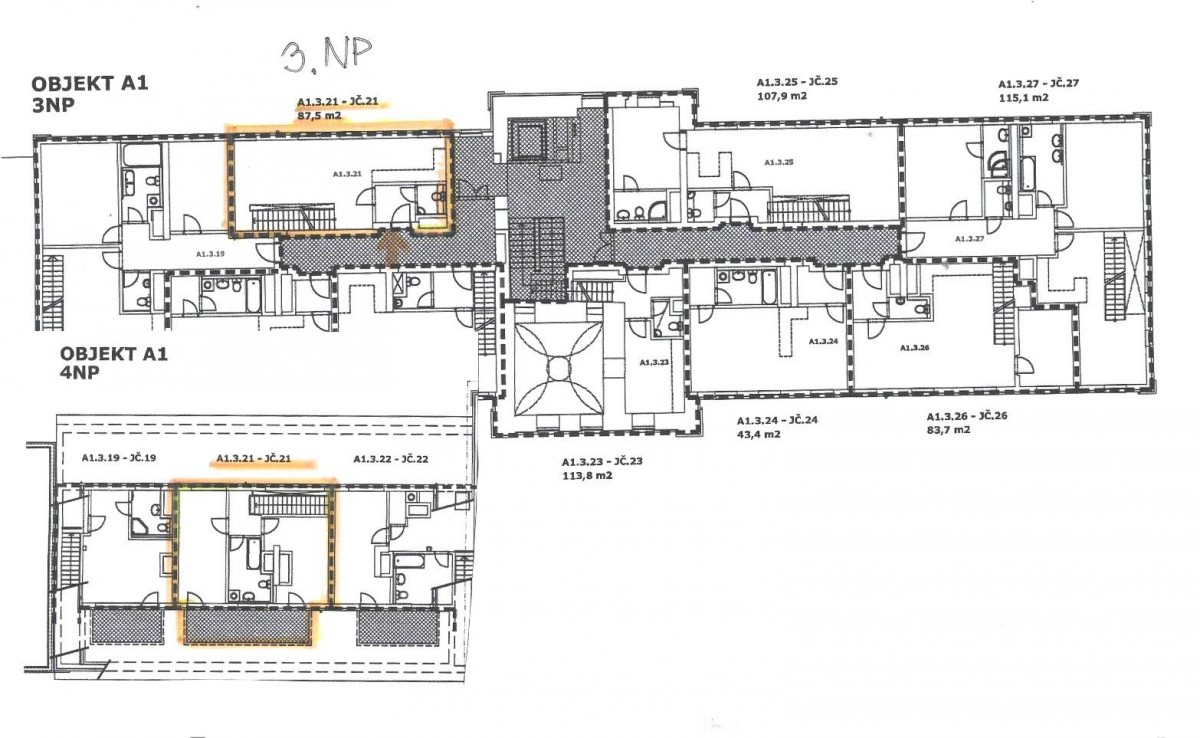 Cihlový byt se nachází v 3. a 4. NP (čtvrté nadzemní patro) bytového domu včetně výtahu. Vytápění zajišťuje vlastní plynová kotelna v domě. V bytovém domě je k dispozici kolárna a kočárkárna.