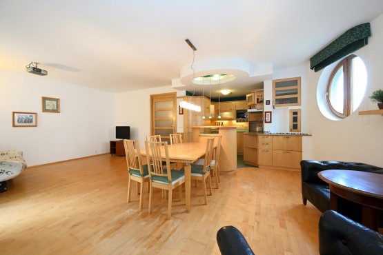 Pronájem zařízeného bytu 3+kk o velikosti 99, 5m2 s terasou a balkonem 24 m2, parkovacím stáním a sklepem.